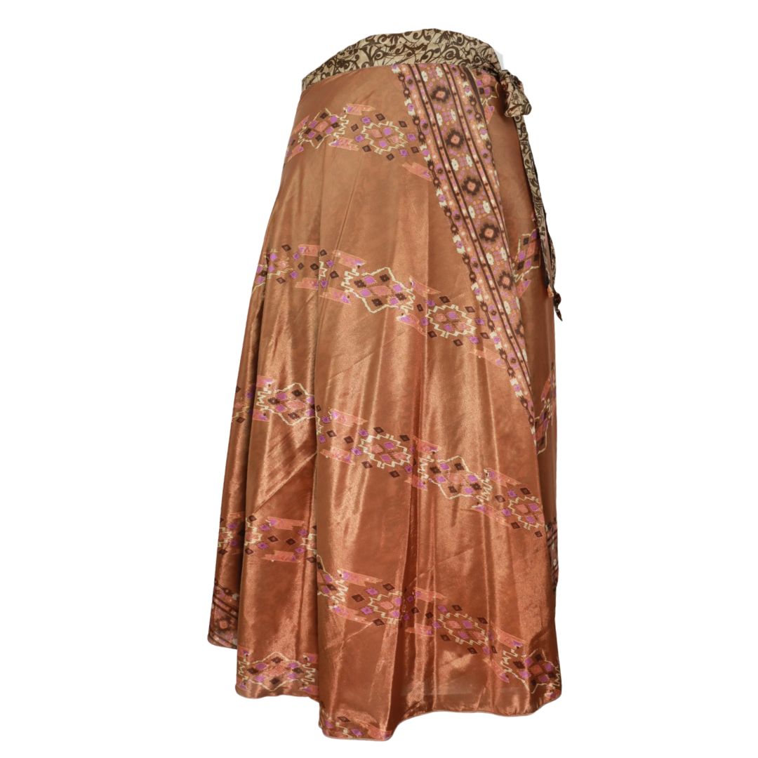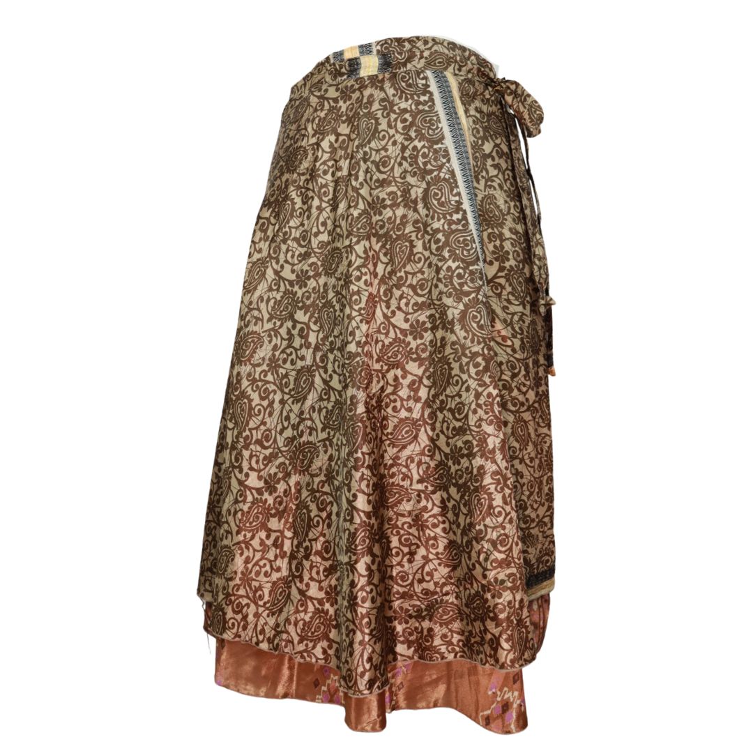 Traditionally Saris are often flamboyant and brightly coloured, frequently embroidered, and made from silk, cotton, or, in recent years, synthetic cloth such as viscose and polyester. We use retro Sari cloth in the majority of our garments so silk is a high component. It is not uncommon to find chiffon or georgette added into the mix which is why we refer to the skirts as a silk blend. We also use 'end of roll' sari fabrics.