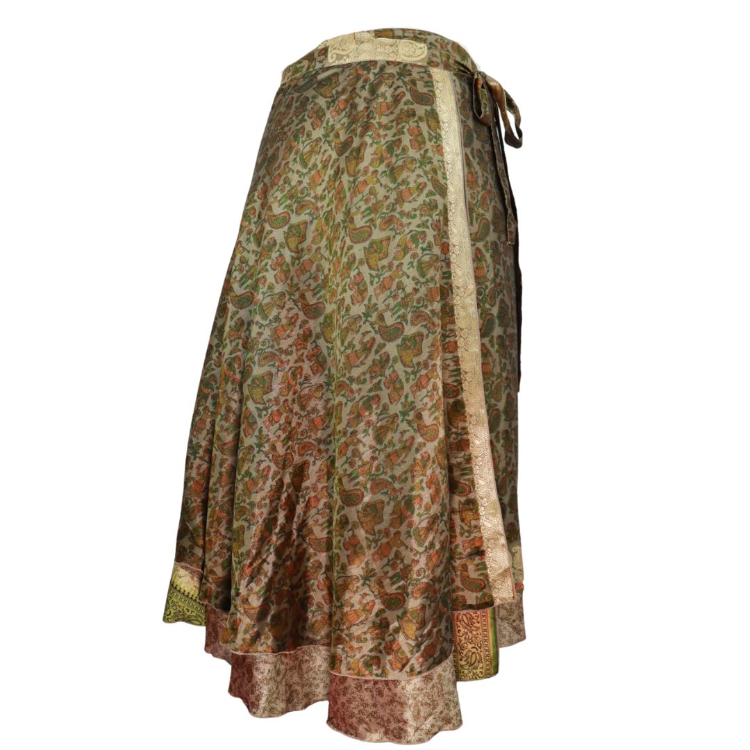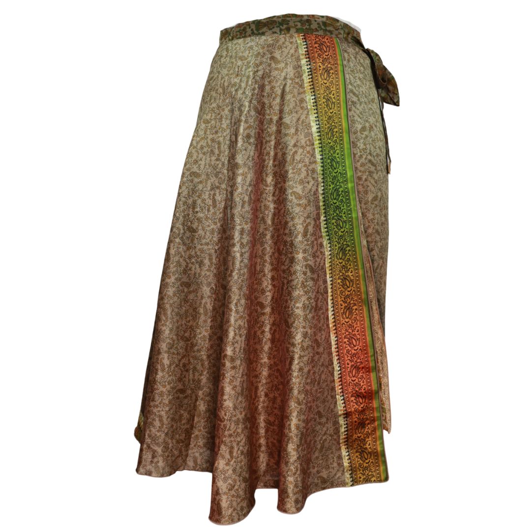 Traditionally Saris are often flamboyant and brightly coloured, frequently embroidered, and made from silk, cotton, or, in recent years, synthetic cloth such as viscose and polyester. We use retro Sari cloth in the majority of our garments so silk is a high component. It is not uncommon to find chiffon or georgette added into the mix which is why we refer to the skirts as a silk blend. We also use 'end of roll' sari fabrics.