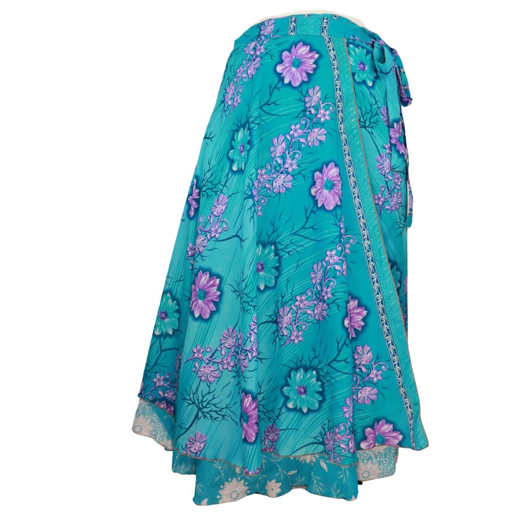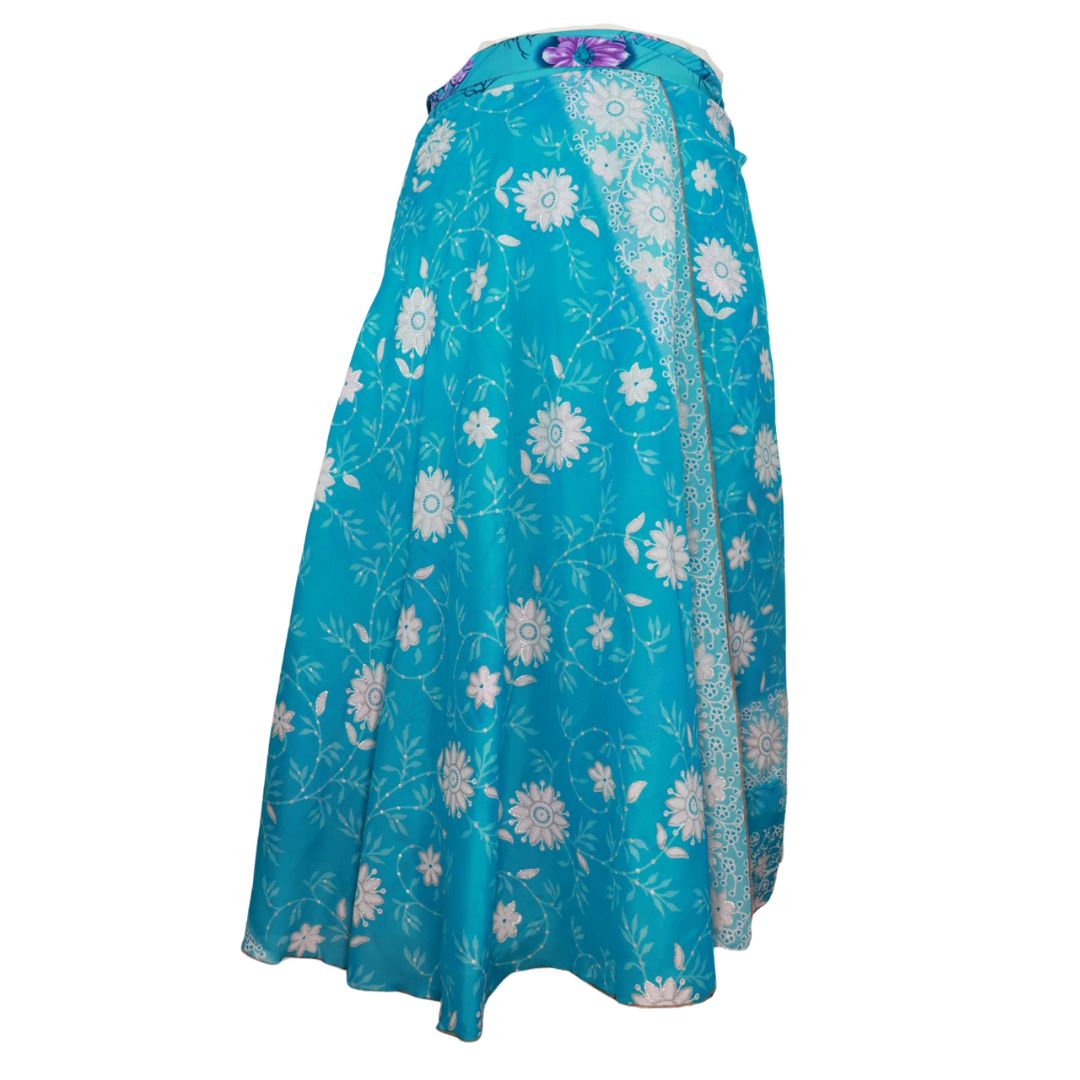 Traditionally Saris are often flamboyant and brightly coloured, frequently embroidered, and made from silk, cotton, or, in recent years, synthetic cloth such as viscose and polyester. We use retro Sari cloth in the majority of our garments so silk is a high component. It is not uncommon to find chiffon or georgette added into the mix which is why we refer to the skirts as a silk blend. We also use 'end of roll' sari fabrics.
