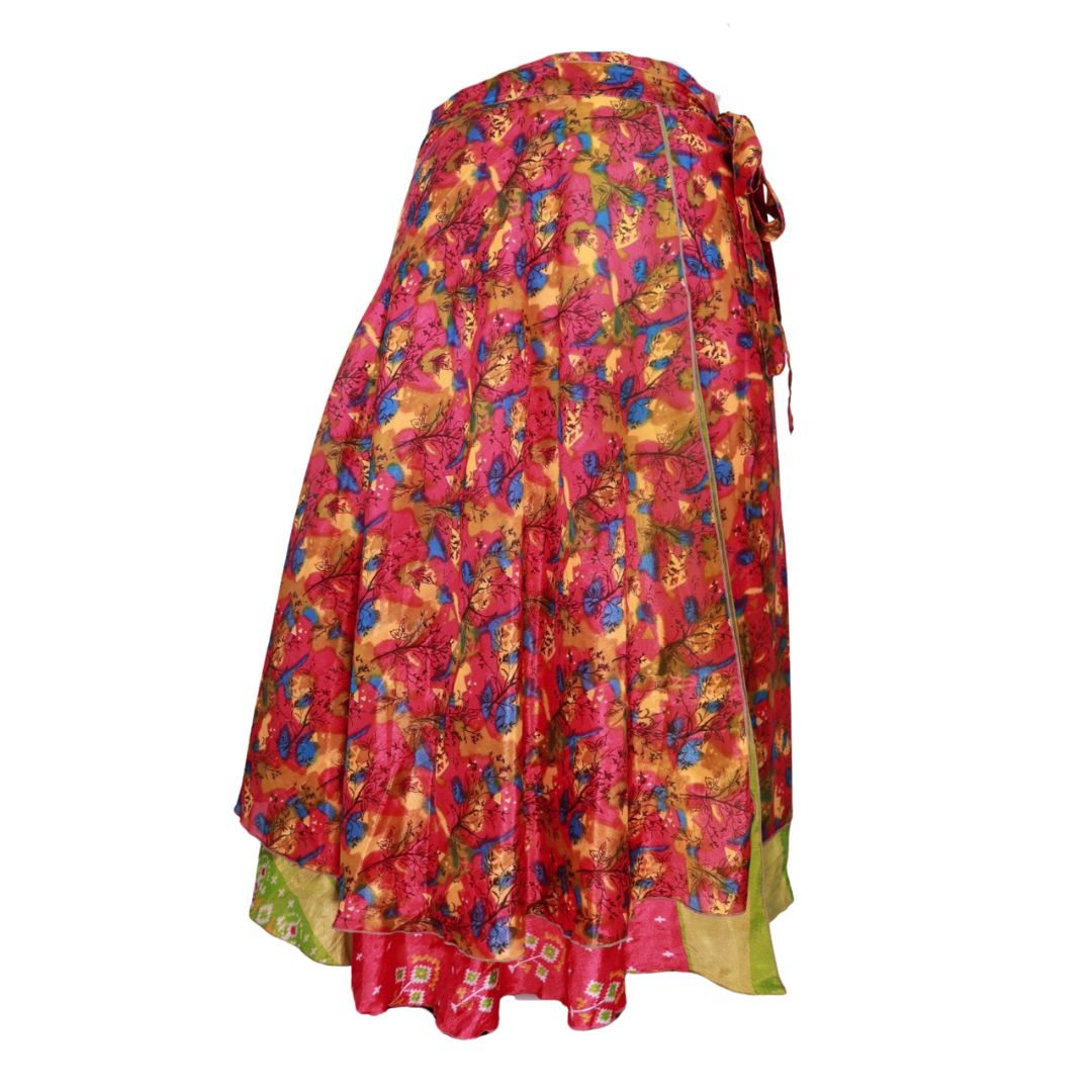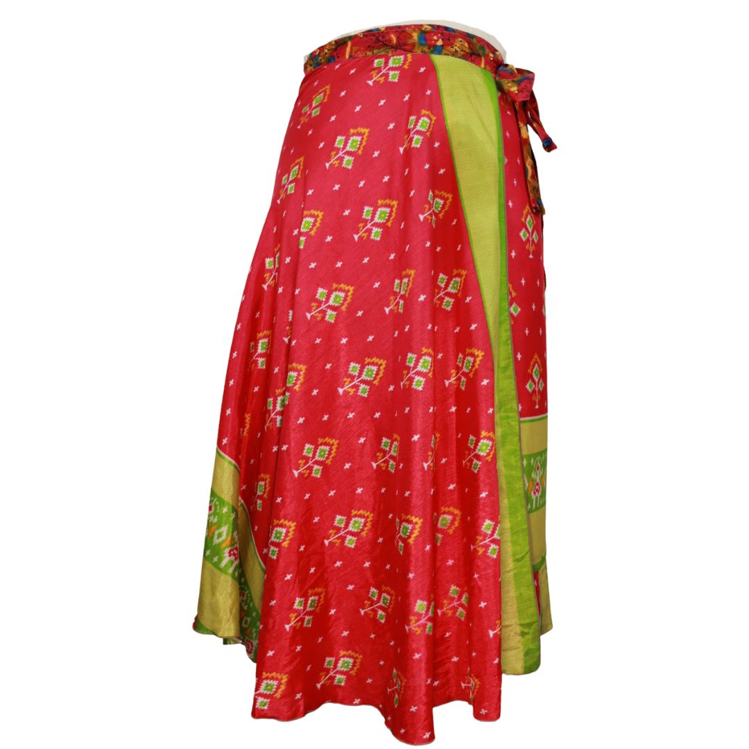 Traditionally Saris are often flamboyant and brightly coloured, frequently embroidered, and made from silk, cotton, or, in recent years, synthetic cloth such as viscose and polyester. We use retro Sari cloth in the majority of our garments so silk is a high component. It is not uncommon to find chiffon or georgette added into the mix which is why we refer to the skirts as a silk blend. We also use 'end of roll' sari fabrics.
