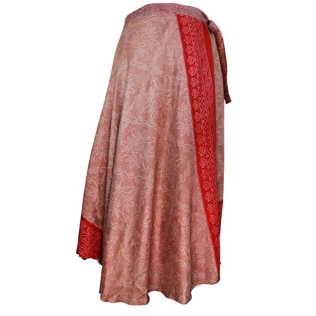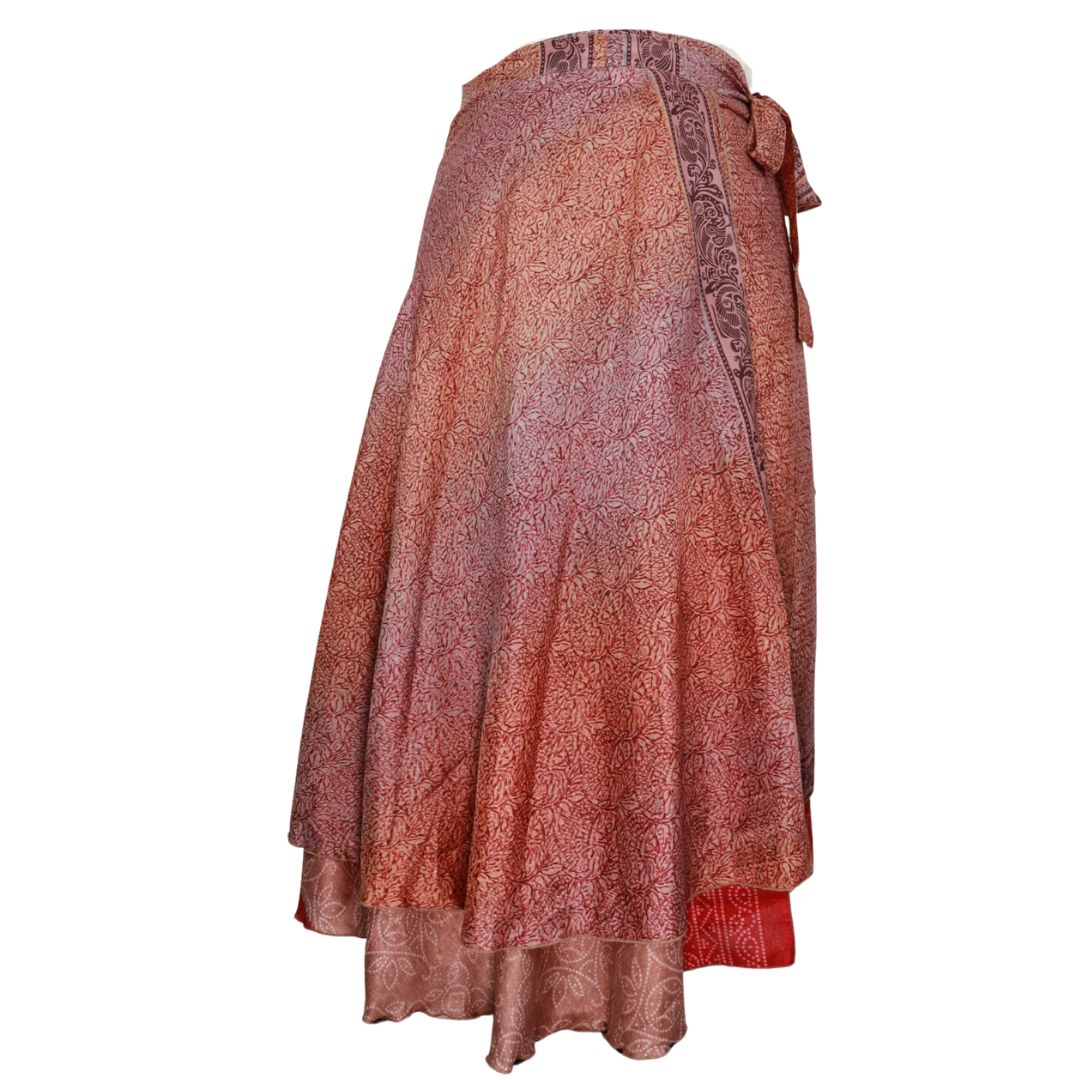 Traditionally Saris are often flamboyant and brightly coloured, frequently embroidered, and made from silk, cotton, or, in recent years, synthetic cloth such as viscose and polyester. We use retro Sari cloth in the majority of our garments so silk is a high component. It is not uncommon to find chiffon or georgette added into the mix which is why we refer to the skirts as a silk blend. We also use 'end of roll' sari fabrics.