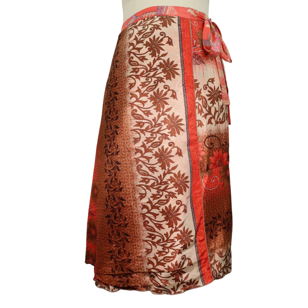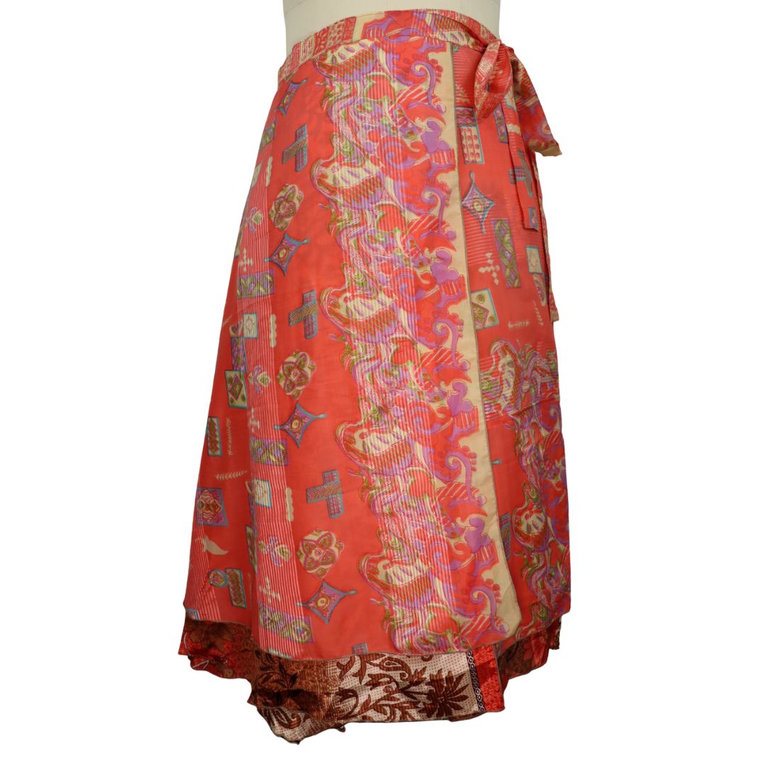 Traditionally Saris are often flamboyant and brightly coloured, frequently embroidered, and made from silk, cotton, or, in recent years, synthetic cloth such as viscose and polyester. We use retro Sari cloth in the majority of our garments so silk is a high component. It is not uncommon to find chiffon or georgette added into the mix which is why we refer to the skirts as a silk blend. We also use 'end of roll' sari fabrics.