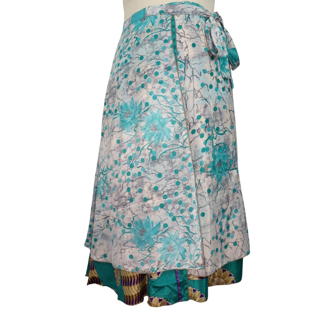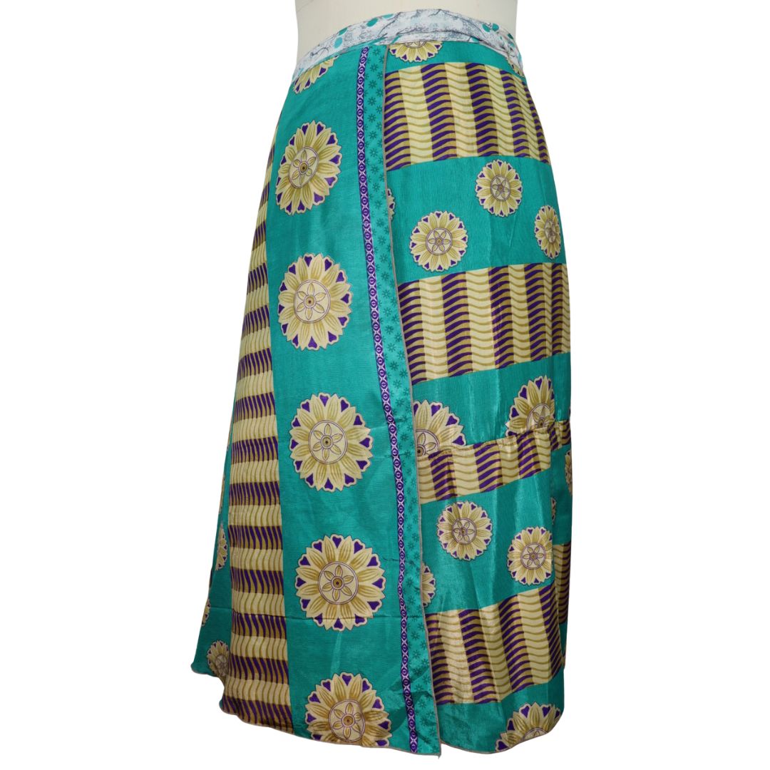 Traditionally Saris are often flamboyant and brightly coloured, frequently embroidered, and made from silk, cotton, or, in recent years, synthetic cloth such as viscose and polyester. We use retro Sari cloth in the majority of our garments so silk is a high component. It is not uncommon to find chiffon or georgette added into the mix which is why we refer to the skirts as a silk blend. We also use 'end of roll' sari fabrics.