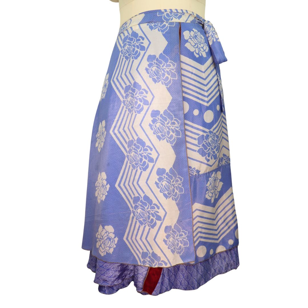 Traditionally Saris are often flamboyant and brightly coloured, frequently embroidered, and made from silk, cotton, or, in recent years, synthetic cloth such as viscose and polyester. We use retro Sari cloth in the majority of our garments so silk is a high component. It is not uncommon to find chiffon or georgette added into the mix which is why we refer to the skirts as a silk blend. We also use 'end of roll' sari fabrics.