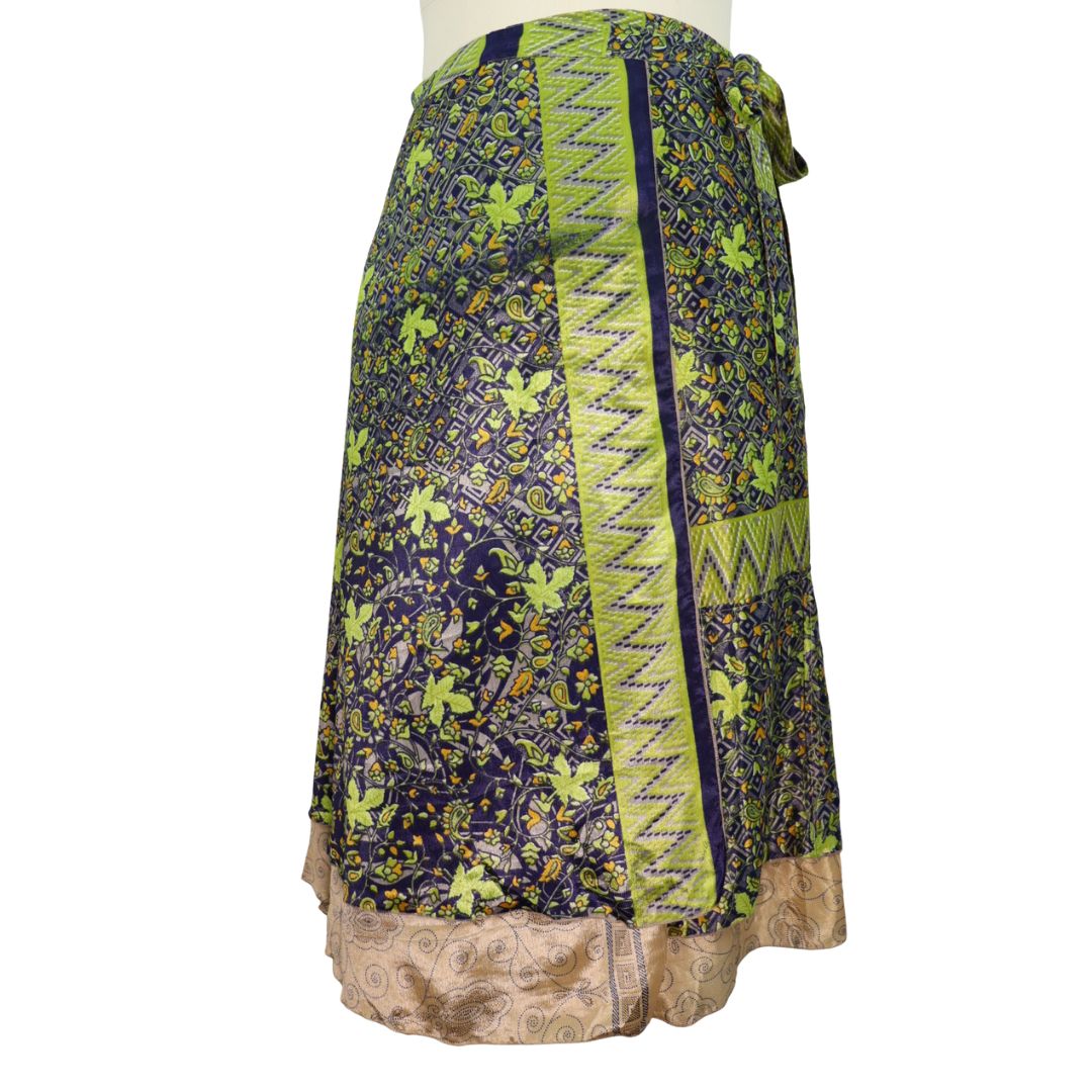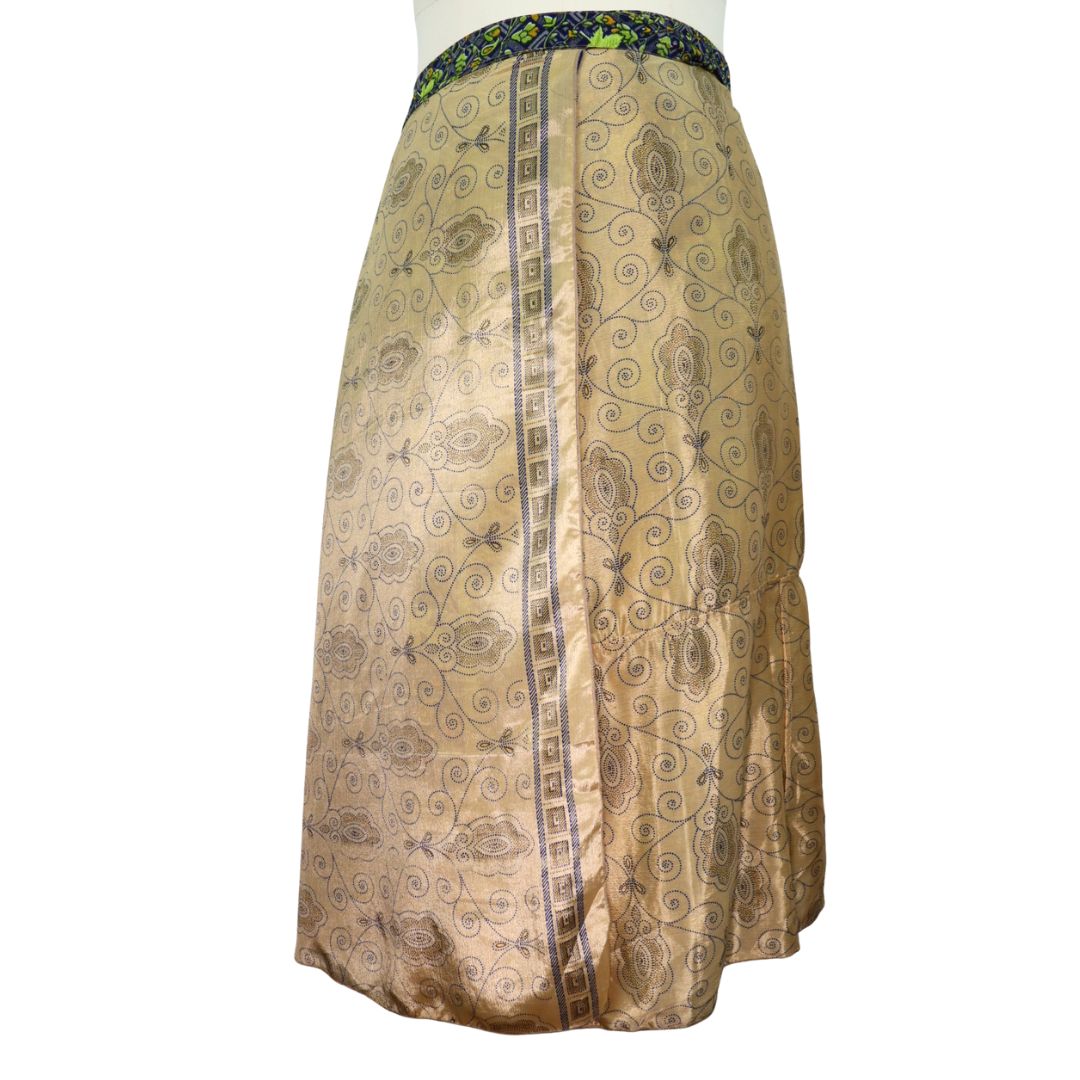 Traditionally Saris are often flamboyant and brightly coloured, frequently embroidered, and made from silk, cotton, or, in recent years, synthetic cloth such as viscose and polyester. We use retro Sari cloth in the majority of our garments so silk is a high component. It is not uncommon to find chiffon or georgette added into the mix which is why we refer to the skirts as a silk blend. We also use 'end of roll' sari fabrics.