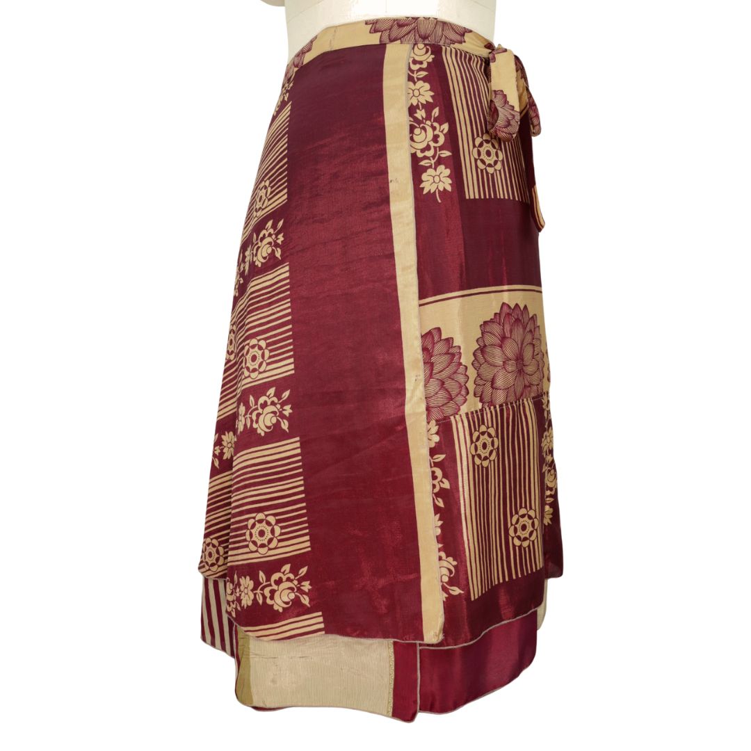 Traditionally Saris are often flamboyant and brightly coloured, frequently embroidered, and made from silk, cotton, or, in recent years, synthetic cloth such as viscose and polyester. We use retro Sari cloth in the majority of our garments so silk is a high component. It is not uncommon to find chiffon or georgette added into the mix which is why we refer to the skirts as a silk blend. We also use 'end of roll' sari fabrics.