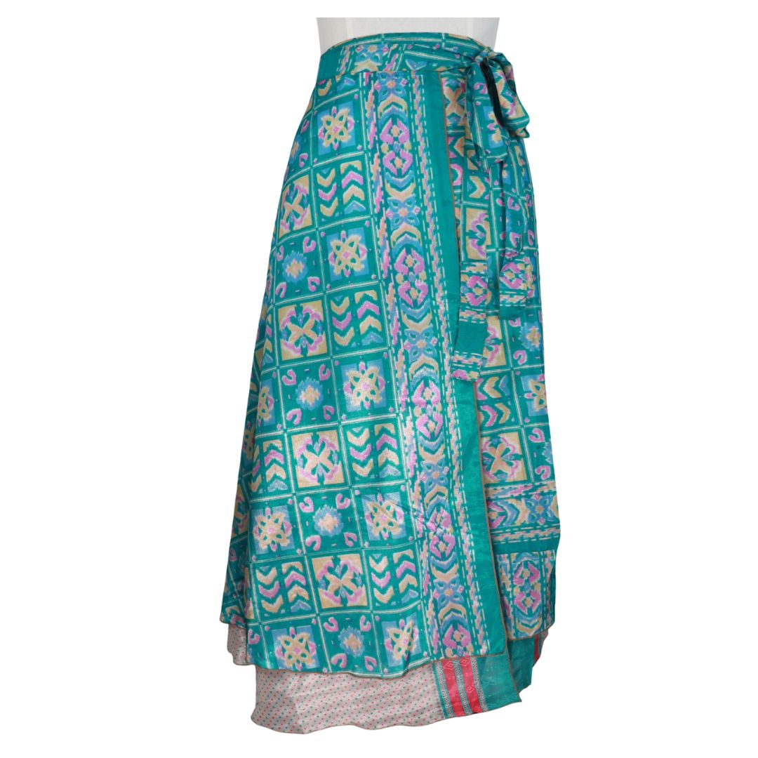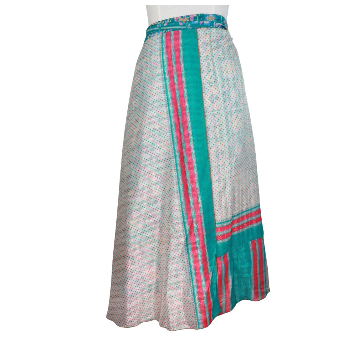 Traditionally Saris are often flamboyant and brightly coloured, frequently embroidered, and made from silk, cotton, or, in recent years, synthetic cloth such as viscose and polyester. We use retro Sari cloth in the majority of our garments so silk is a high component. It is not uncommon to find chiffon or georgette added into the mix which is why we refer to the skirts as a silk blend. We also use 'end of roll' sari fabrics.