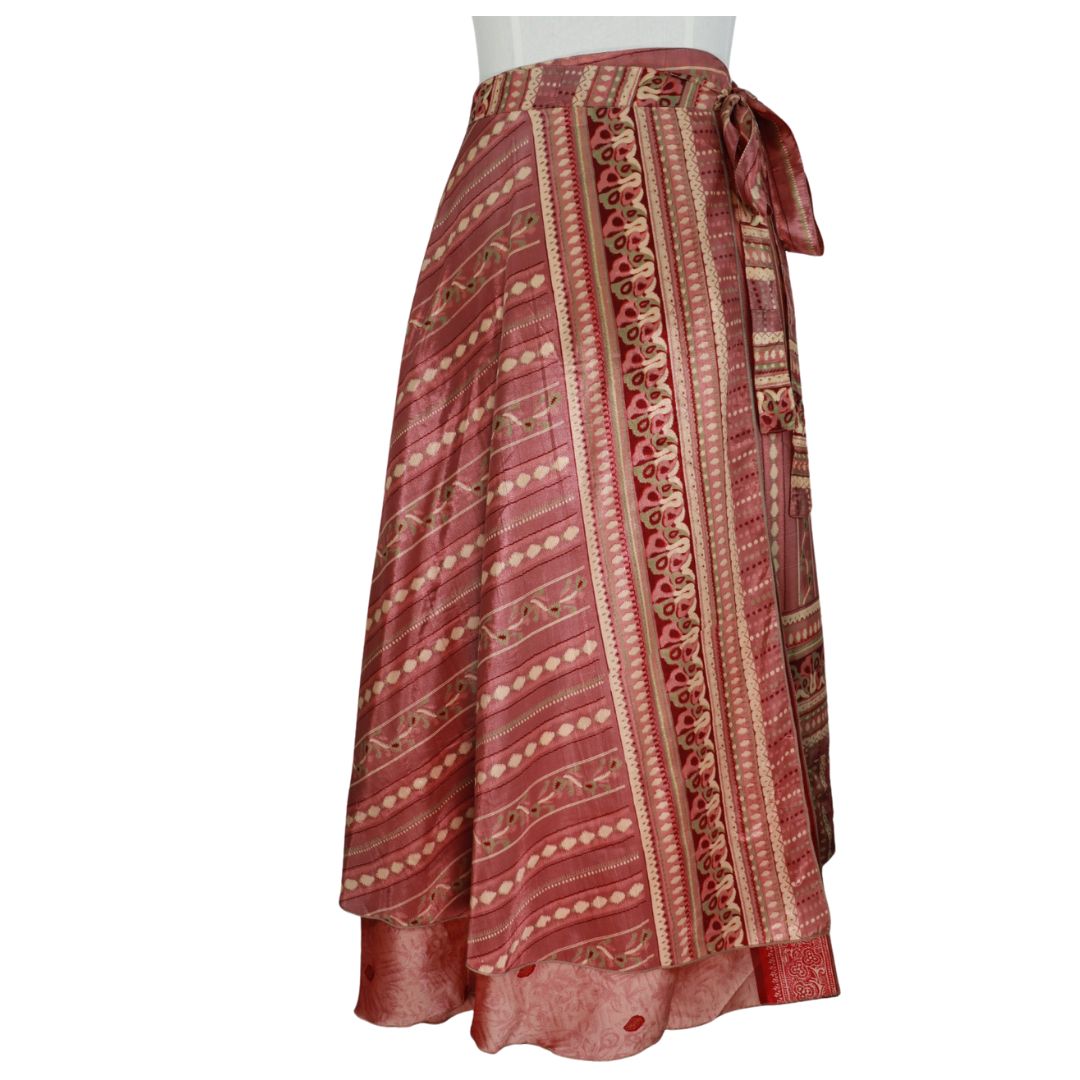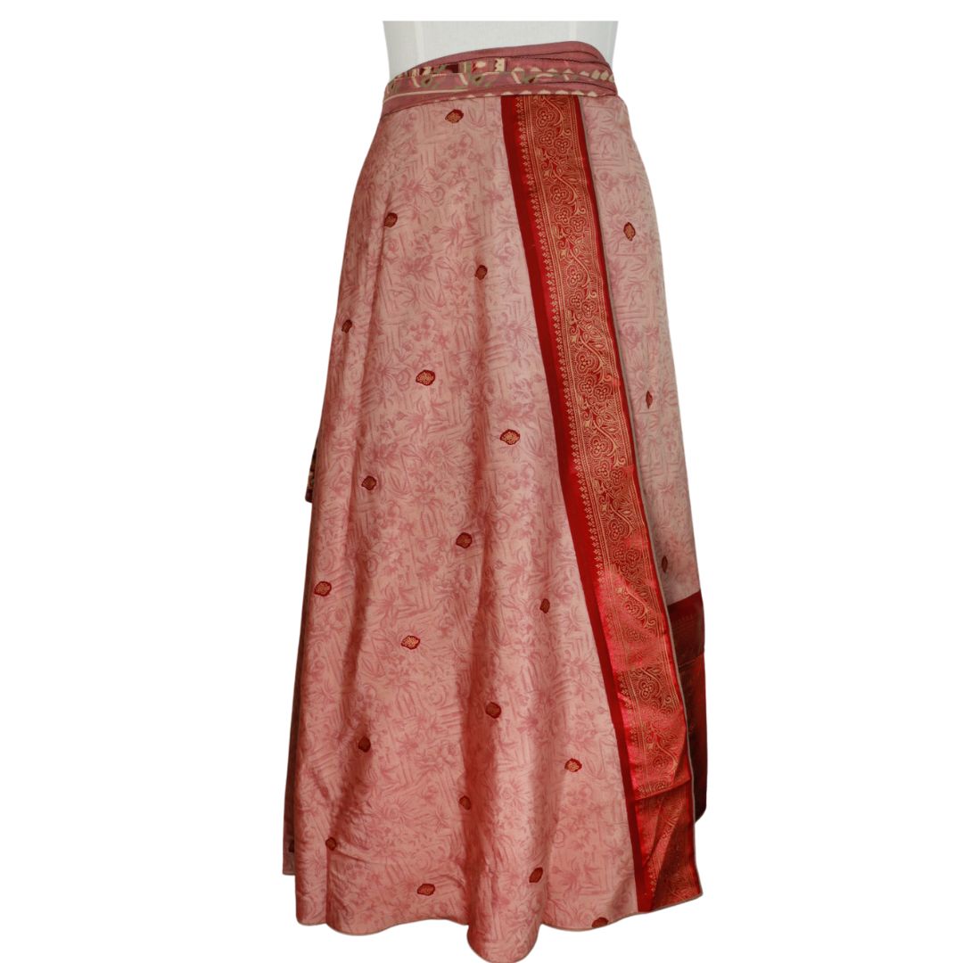 Traditionally Saris are often flamboyant and brightly coloured, frequently embroidered, and made from silk, cotton, or, in recent years, synthetic cloth such as viscose and polyester. We use retro Sari cloth in the majority of our garments so silk is a high component. It is not uncommon to find chiffon or georgette added into the mix which is why we refer to the skirts as a silk blend. We also use 'end of roll' sari fabrics.