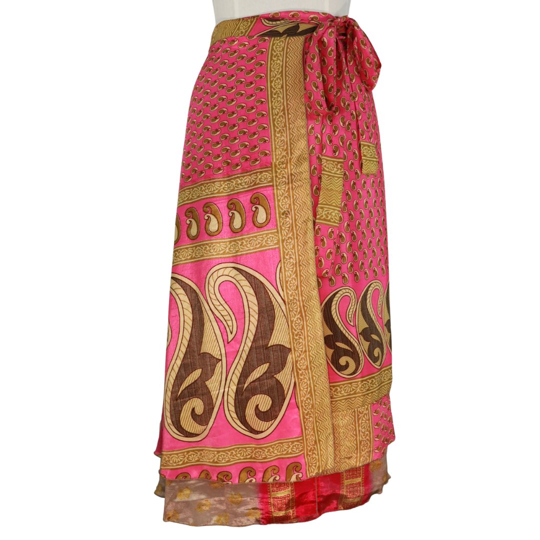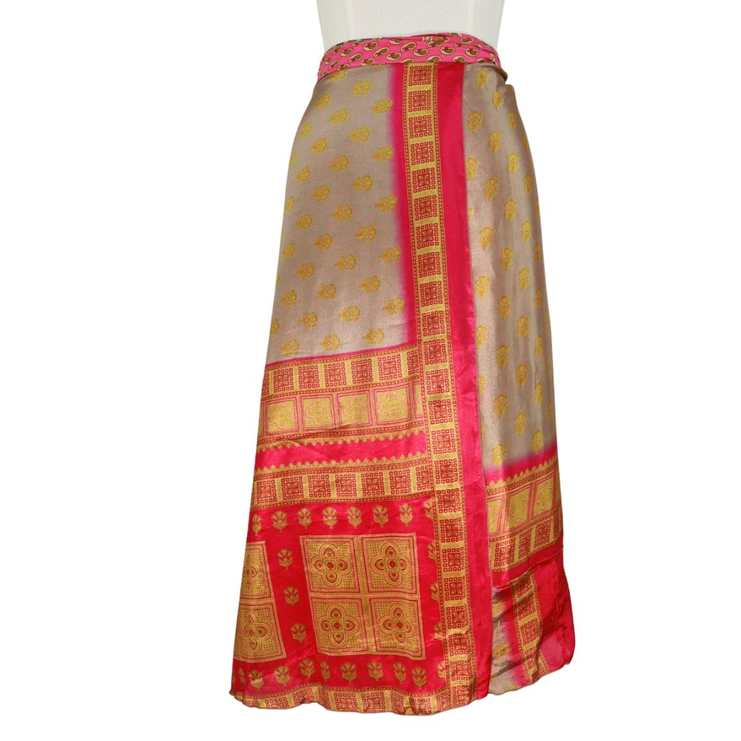 Traditionally Saris are often flamboyant and brightly coloured, frequently embroidered, and made from silk, cotton, or, in recent years, synthetic cloth such as viscose and polyester. We use retro Sari cloth in the majority of our garments so silk is a high component. It is not uncommon to find chiffon or georgette added into the mix which is why we refer to the skirts as a silk blend. We also use 'end of roll' sari fabrics.