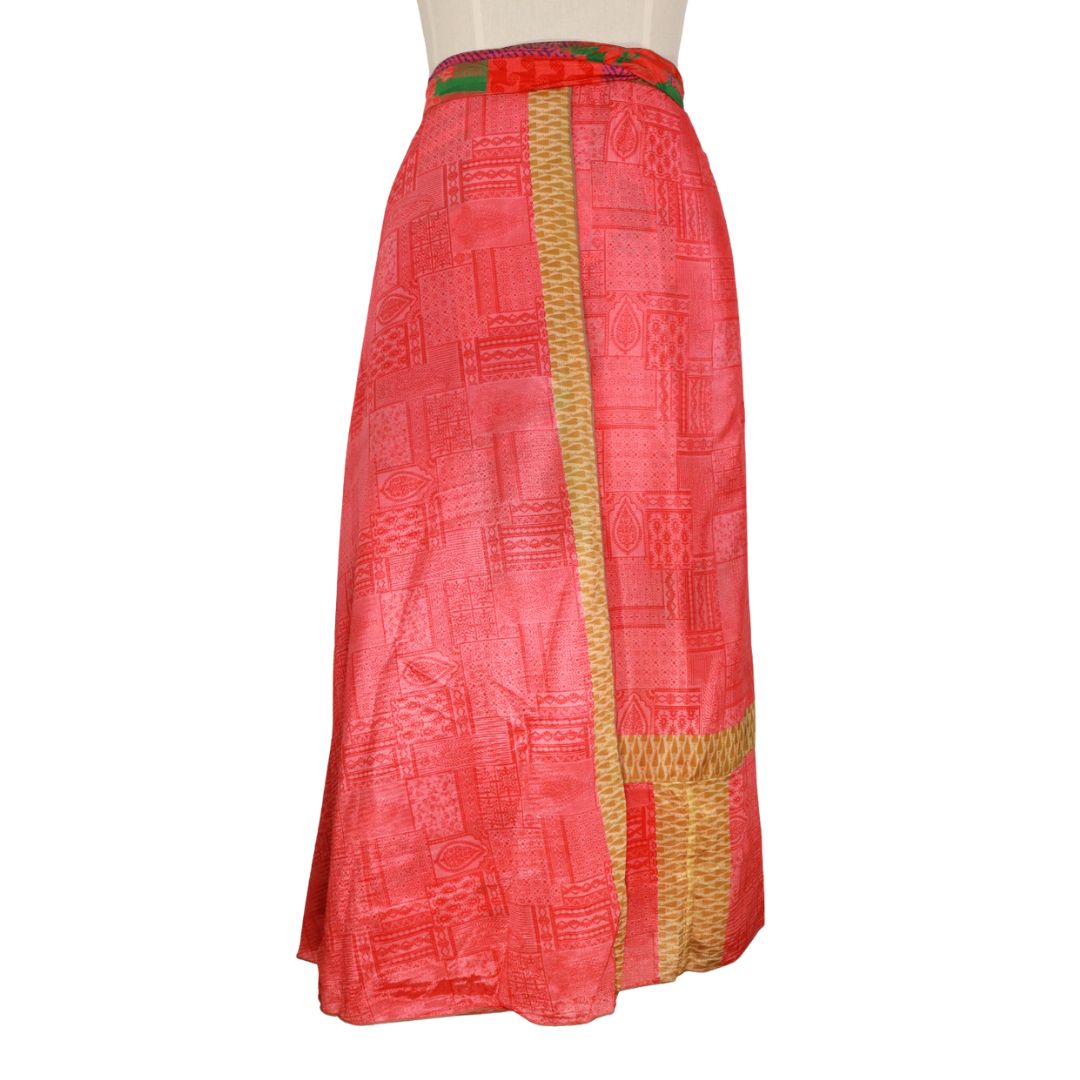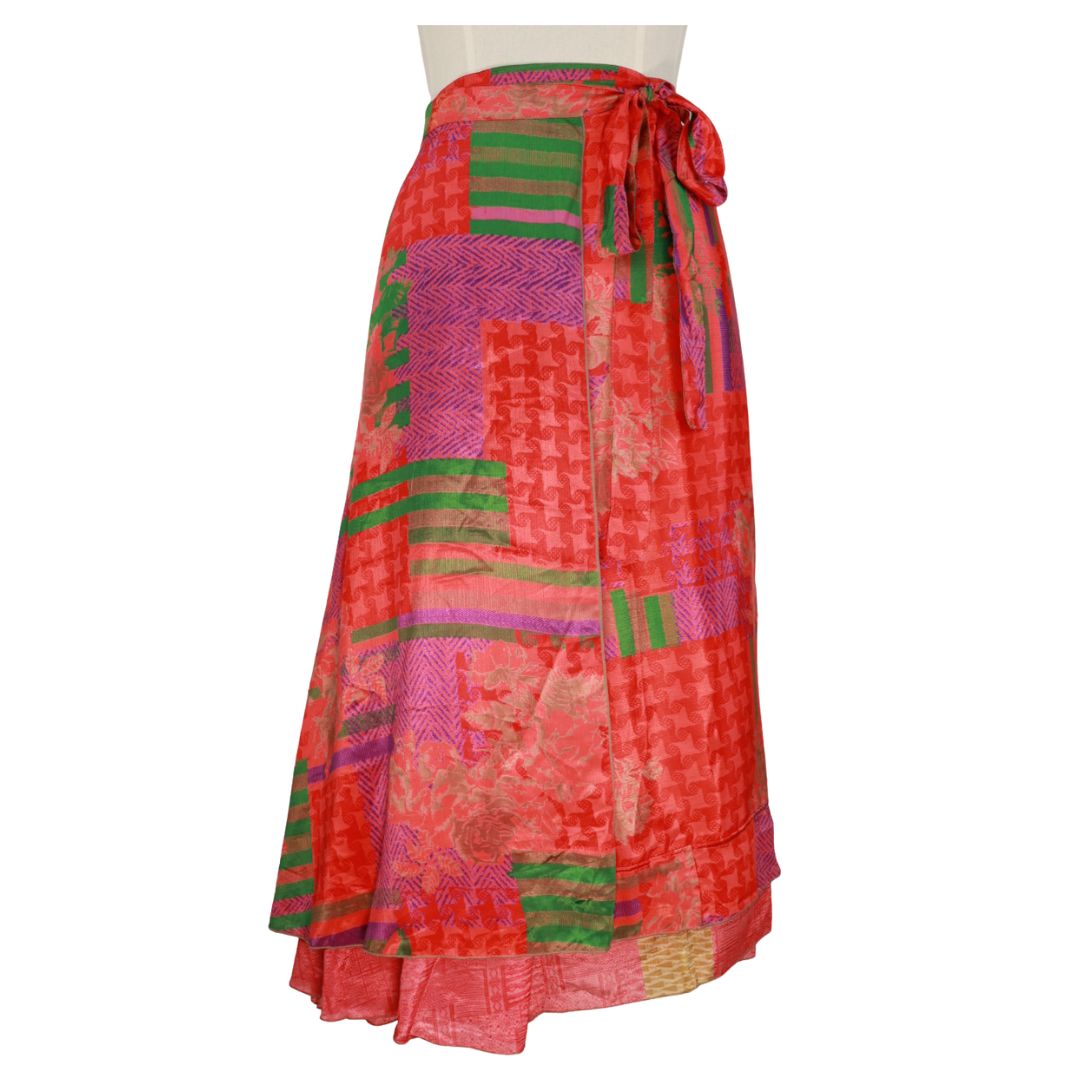 Traditionally Saris are often flamboyant and brightly coloured, frequently embroidered, and made from silk, cotton, or, in recent years, synthetic cloth such as viscose and polyester. We use retro Sari cloth in the majority of our garments so silk is a high component. It is not uncommon to find chiffon or georgette added into the mix which is why we refer to the skirts as a silk blend. We also use 'end of roll' sari fabrics.