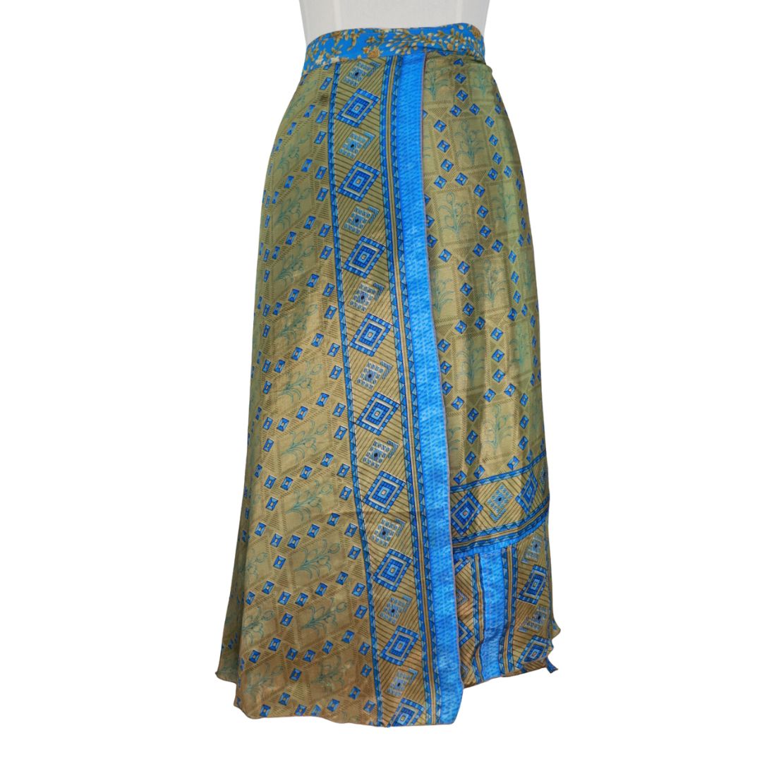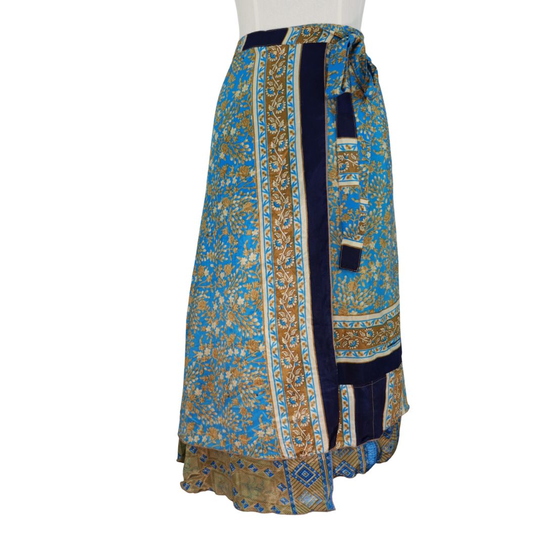 Traditionally Saris are often flamboyant and brightly coloured, frequently embroidered, and made from silk, cotton, or, in recent years, synthetic cloth such as viscose and polyester. We use retro Sari cloth in the majority of our garments so silk is a high component. It is not uncommon to find chiffon or georgette added into the mix which is why we refer to the skirts as a silk blend. We also use 'end of roll' sari fabrics.