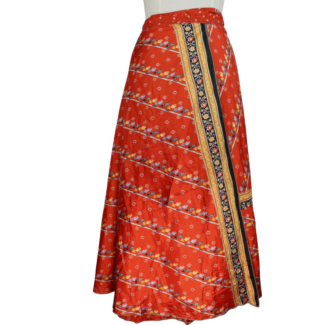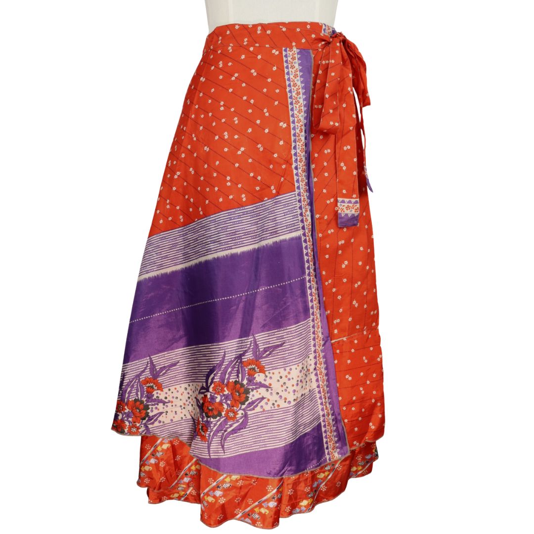 Traditionally Saris are often flamboyant and brightly coloured, frequently embroidered, and made from silk, cotton, or, in recent years, synthetic cloth such as viscose and polyester. We use retro Sari cloth in the majority of our garments so silk is a high component. It is not uncommon to find chiffon or georgette added into the mix which is why we refer to the skirts as a silk blend. We also use 'end of roll' sari fabrics.