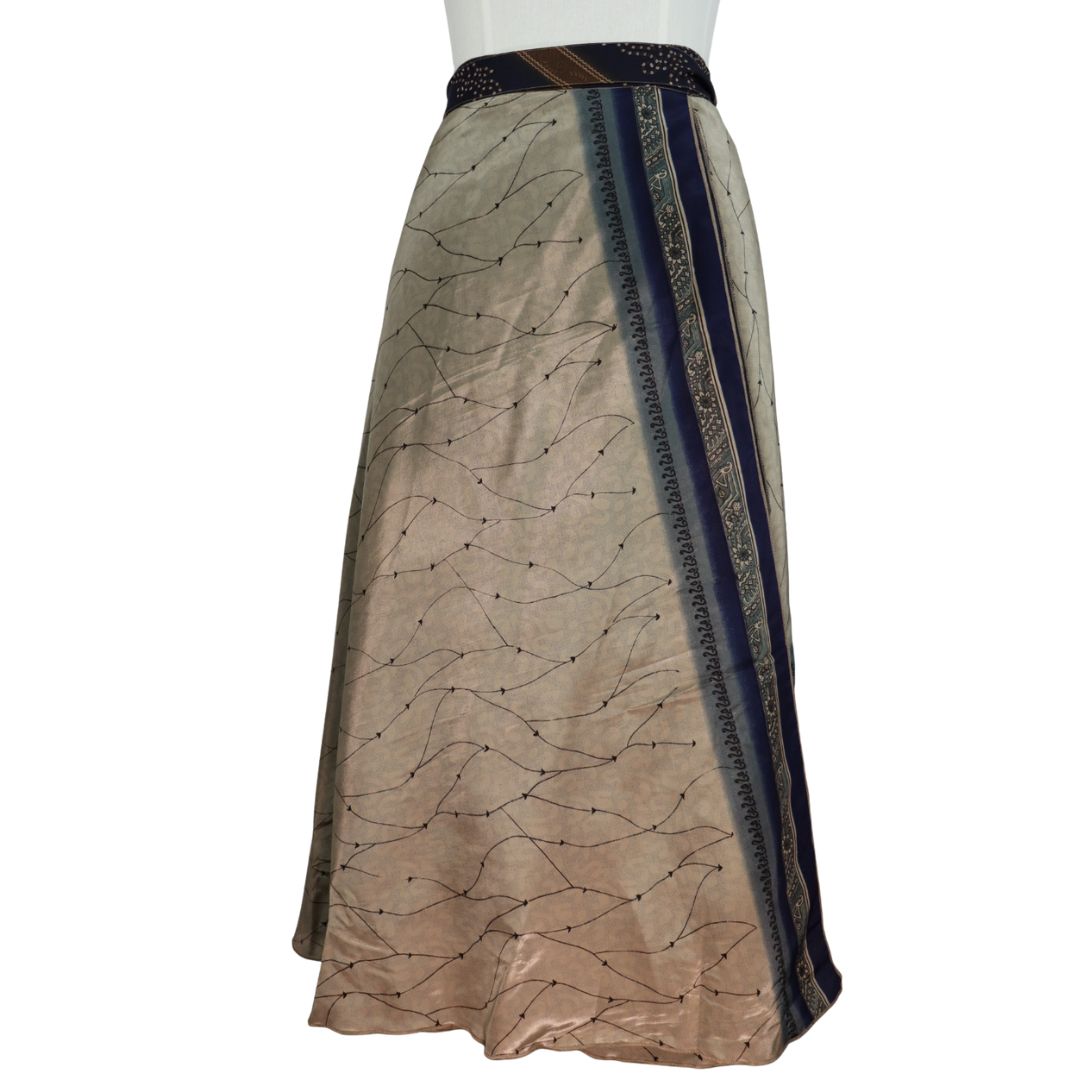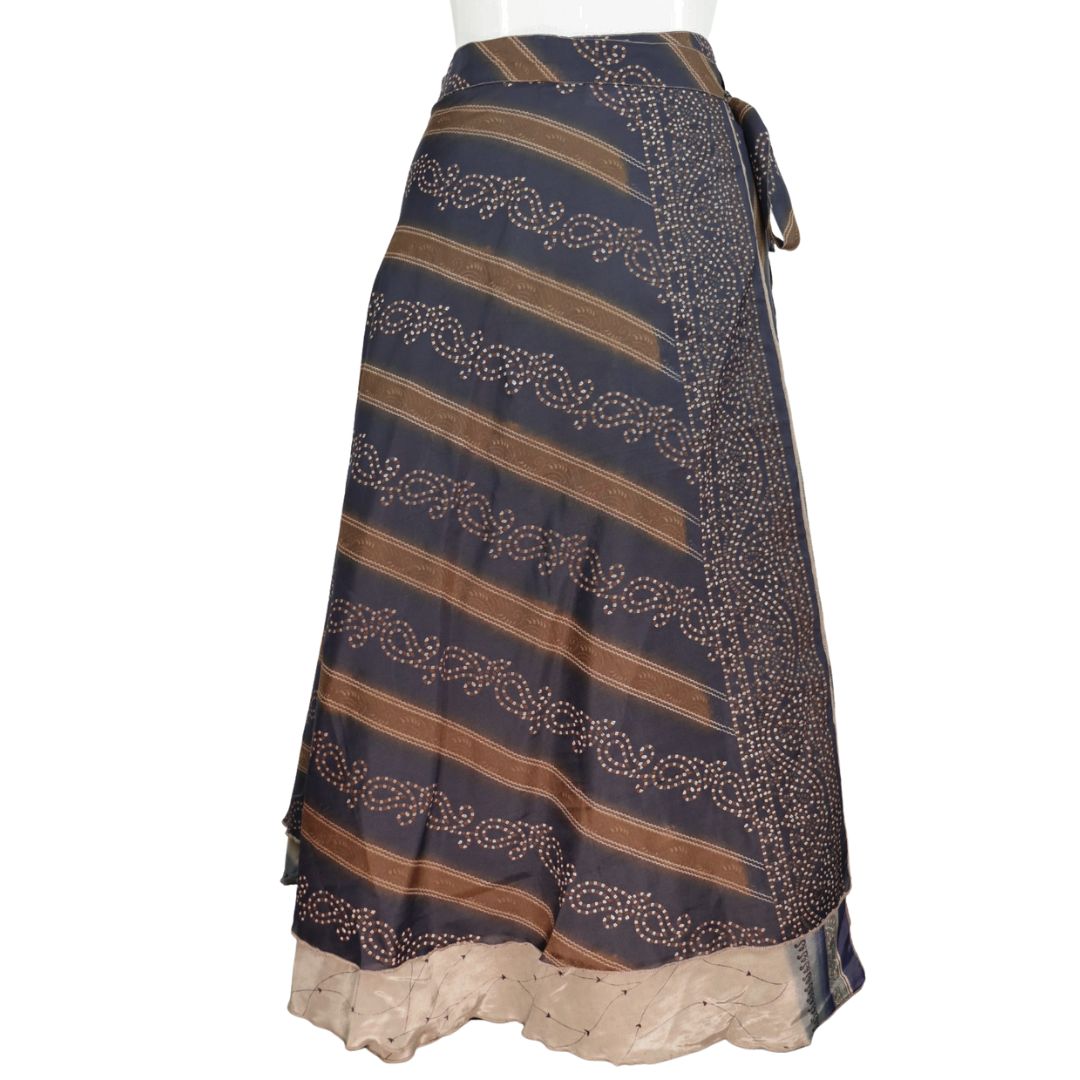 Traditionally Saris are often flamboyant and brightly coloured, frequently embroidered, and made from silk, cotton, or, in recent years, synthetic cloth such as viscose and polyester. We use retro Sari cloth in the majority of our garments so silk is a high component. It is not uncommon to find chiffon or georgette added into the mix which is why we refer to the skirts as a silk blend. We also use 'end of roll' sari fabrics.