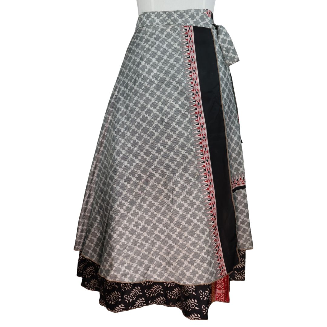 Traditionally Saris are often flamboyant and brightly coloured, frequently embroidered, and made from silk, cotton, or, in recent years, synthetic cloth such as viscose and polyester. We use retro Sari cloth in the majority of our garments so silk is a high component. It is not uncommon to find chiffon or georgette added into the mix which is why we refer to the skirts as a silk blend. We also use 'end of roll' sari fabrics.