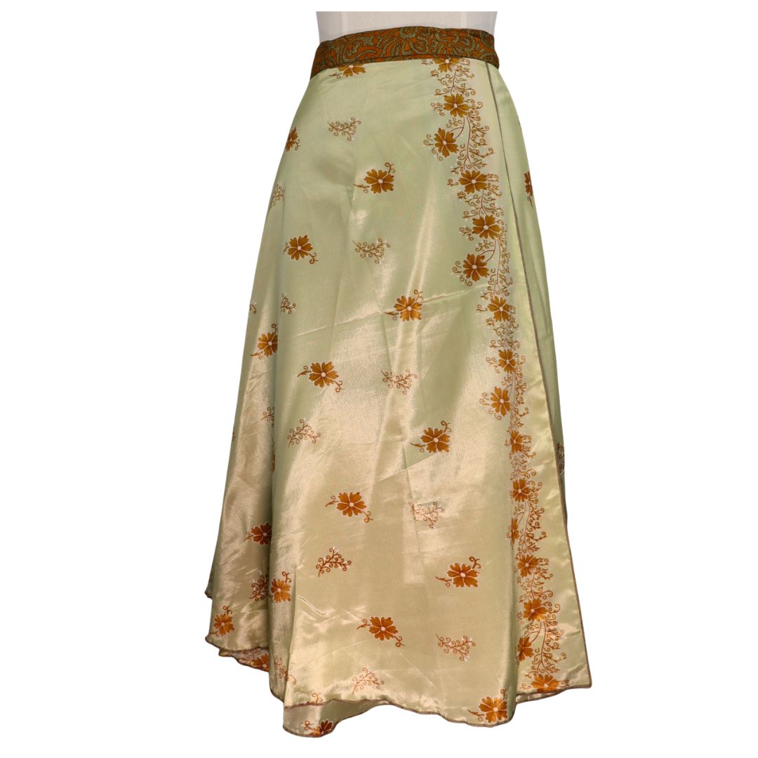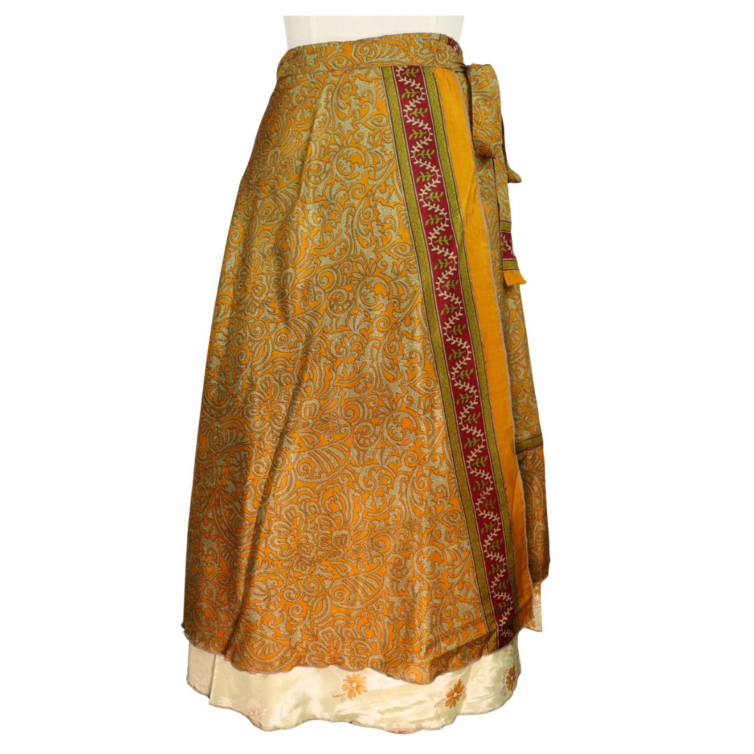 Traditionally Saris are often flamboyant and brightly coloured, frequently embroidered, and made from silk, cotton, or, in recent years, synthetic cloth such as viscose and polyester. We use retro Sari cloth in the majority of our garments so silk is a high component. It is not uncommon to find chiffon or georgette added into the mix which is why we refer to the skirts as a silk blend. We also use 'end of roll' sari fabrics.