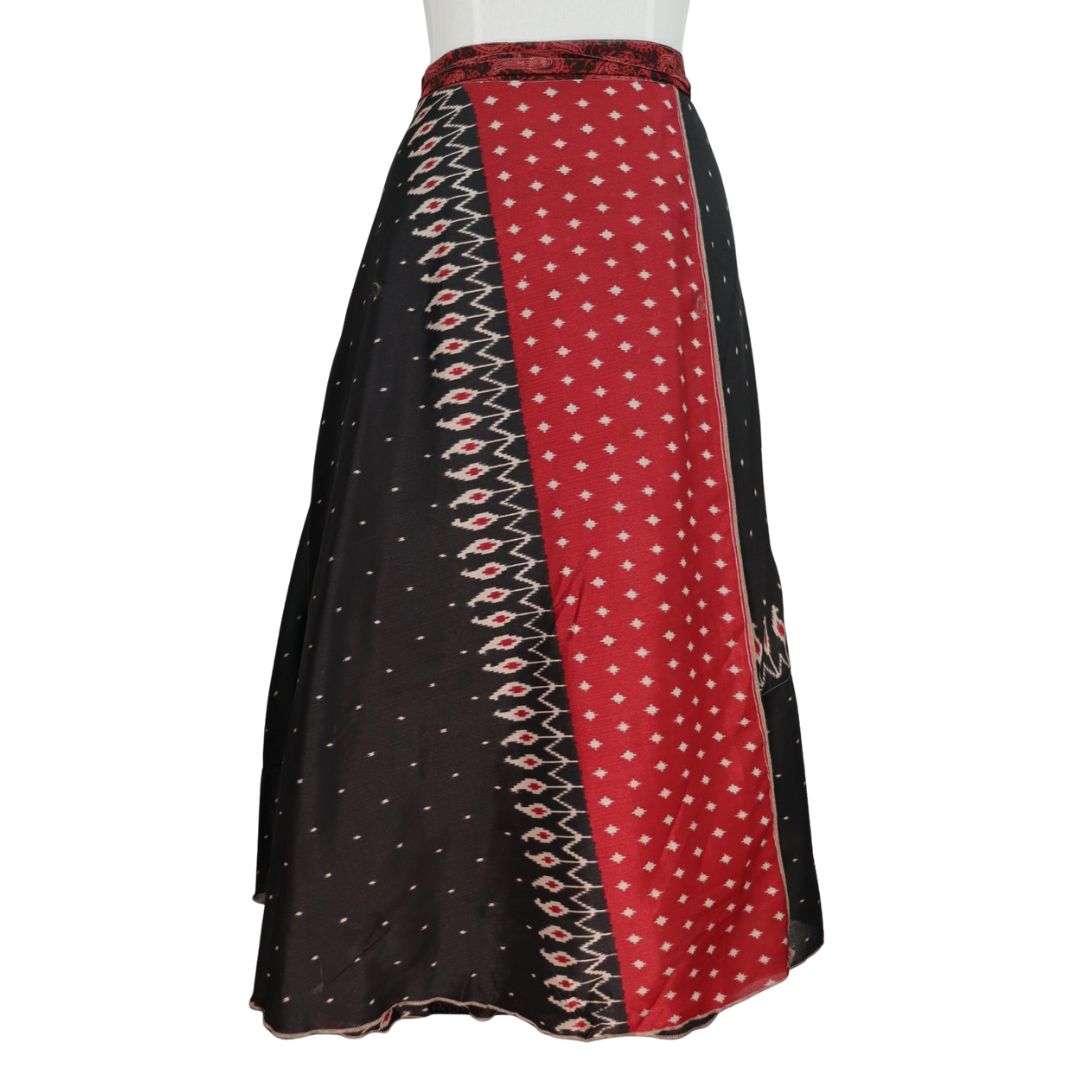 Traditionally Saris are often flamboyant and brightly coloured, frequently embroidered, and made from silk, cotton, or, in recent years, synthetic cloth such as viscose and polyester. We use retro Sari cloth in the majority of our garments so silk is a high component. It is not uncommon to find chiffon or georgette added into the mix which is why we refer to the skirts as a silk blend. We also use 'end of roll' sari fabrics.