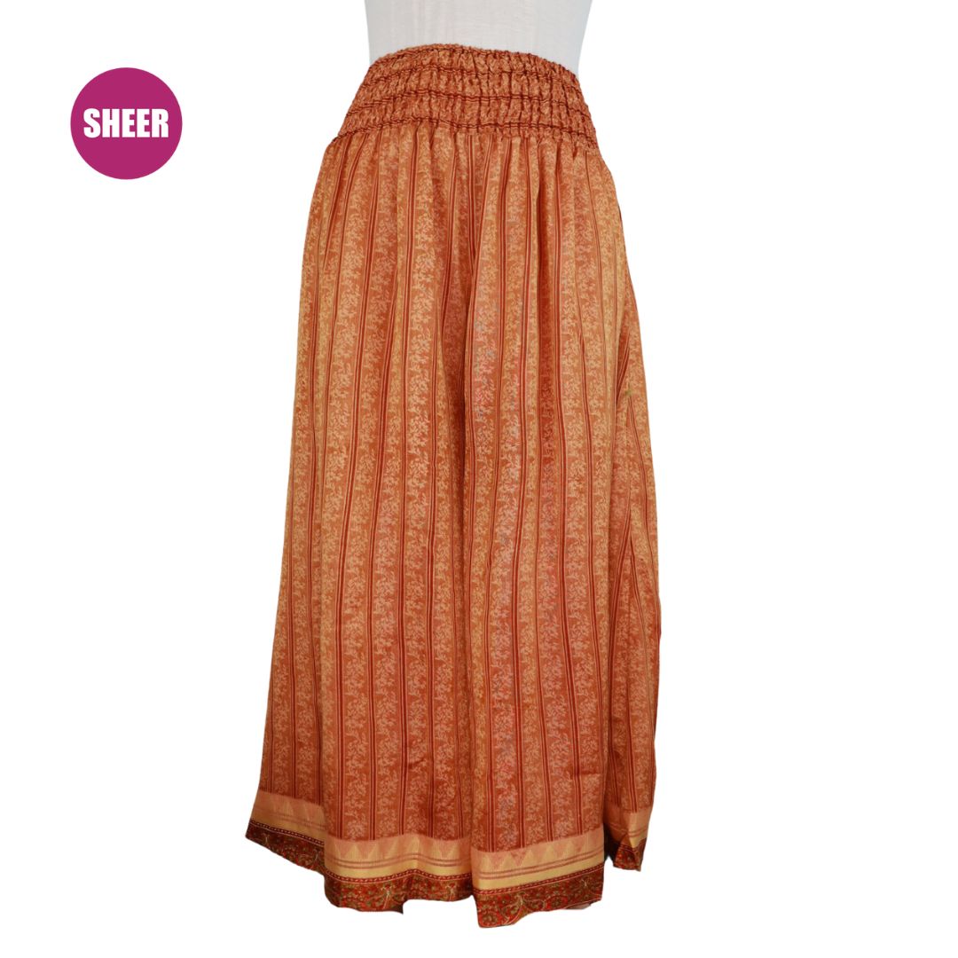 Traditionally Saris are often flamboyant and brightly coloured, frequently embroidered, and made from silk, cotton, or, in recent years, synthetic cloth such as viscose and polyester. We use retro Sari cloth in the majority of our garments so silk is a high component. It is not uncommon to find chiffon or georgette added into the mix which is why we refer to the skirts as a silk blend. We also use 'end of roll' sari fabrics.