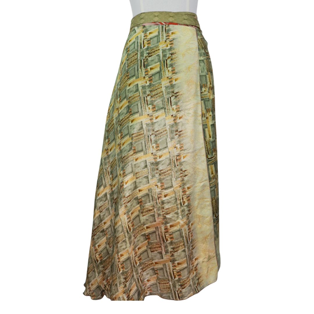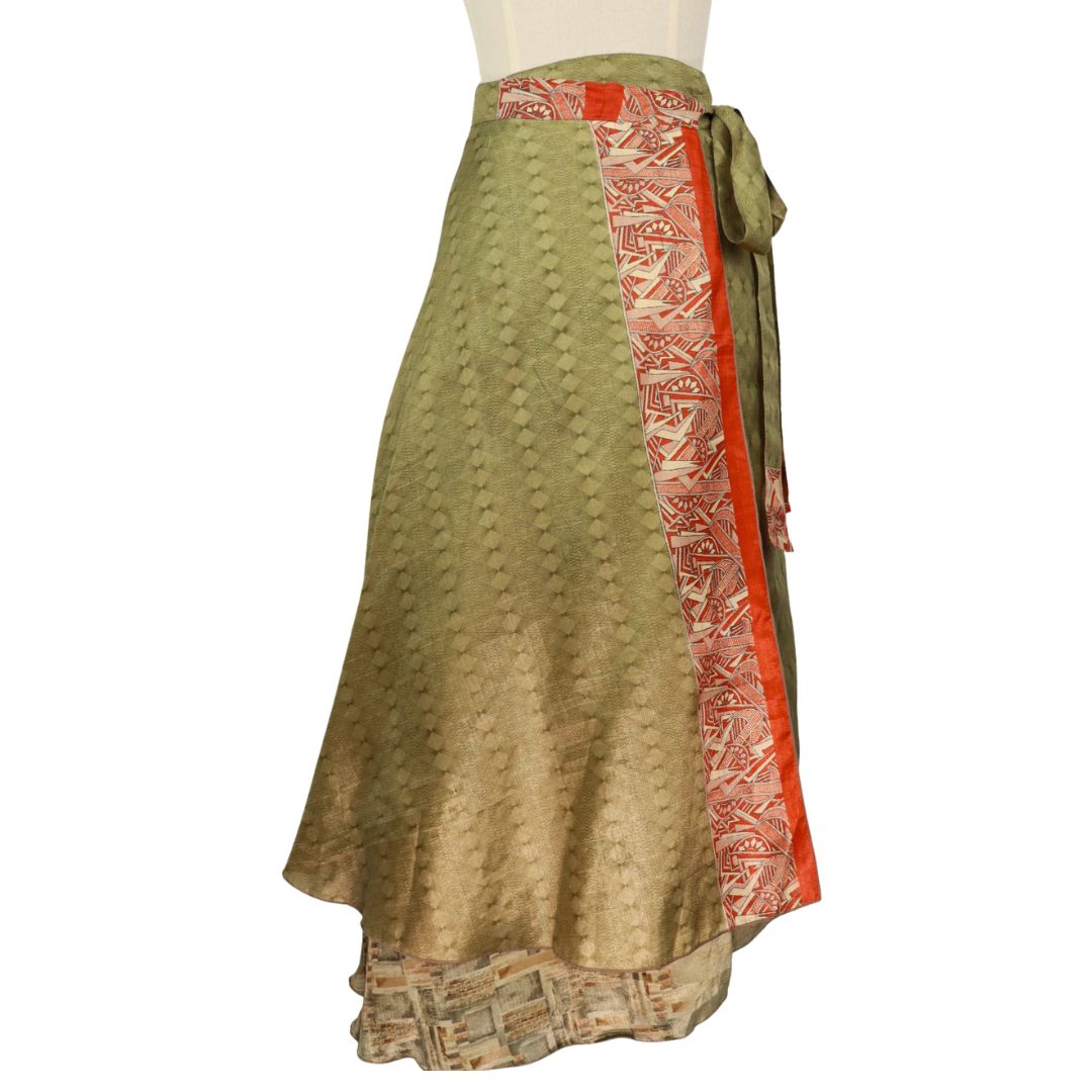 Traditionally Saris are often flamboyant and brightly coloured, frequently embroidered, and made from silk, cotton, or, in recent years, synthetic cloth such as viscose and polyester. We use retro Sari cloth in the majority of our garments so silk is a high component. It is not uncommon to find chiffon or georgette added into the mix which is why we refer to the skirts as a silk blend. We also use 'end of roll' sari fabrics.