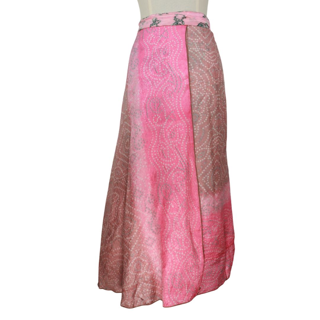 Traditionally Saris are often flamboyant and brightly coloured, frequently embroidered, and made from silk, cotton, or, in recent years, synthetic cloth such as viscose and polyester. We use retro Sari cloth in the majority of our garments so silk is a high component. It is not uncommon to find chiffon or georgette added into the mix which is why we refer to the skirts as a silk blend. We also use 'end of roll' sari fabrics.