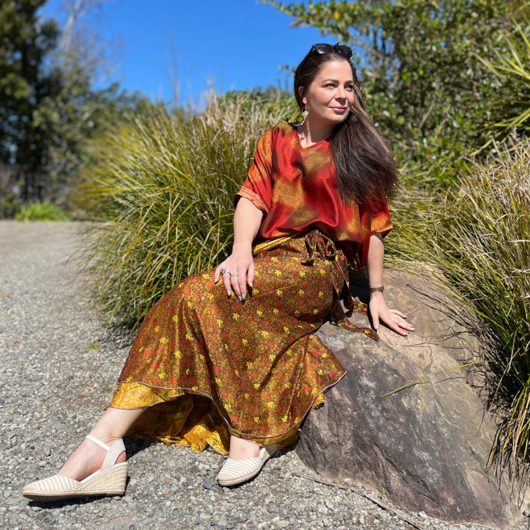 Traditionally Saris are often flamboyant and brightly coloured, frequently embroidered, and made from silk, cotton, or, in recent years, synthetic cloth such as viscose and polyester. We use retro Sari cloth in the majority of our garments so silk is a high component. It is not uncommon to find chiffon or georgette added into the mix which is why we refer to the skirts as a silk blend. We also use 'end of roll' sari fabrics.