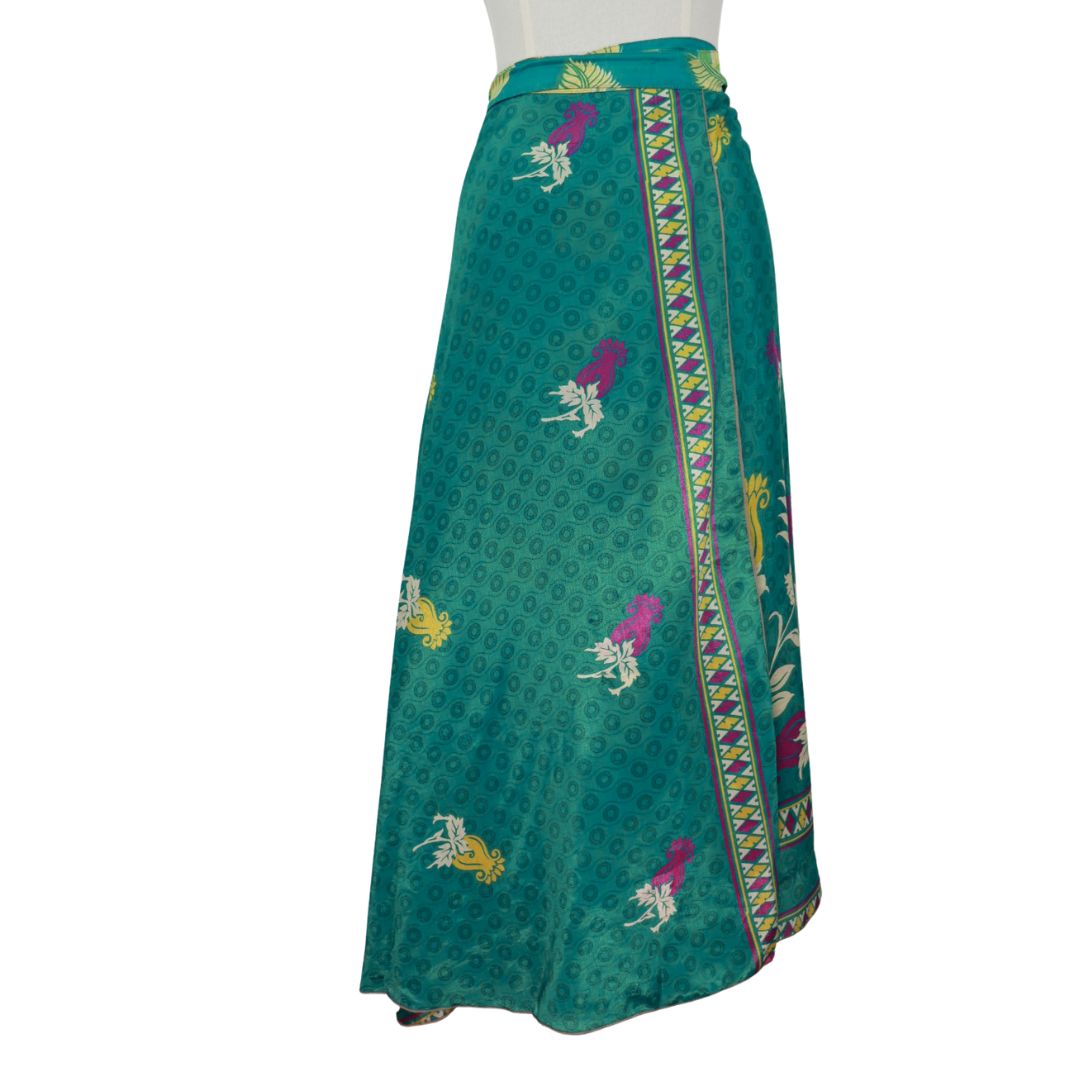 Traditionally Saris are often flamboyant and brightly coloured, frequently embroidered, and made from silk, cotton, or, in recent years, synthetic cloth such as viscose and polyester. We use retro Sari cloth in the majority of our garments so silk is a high component. It is not uncommon to find chiffon or georgette added into the mix which is why we refer to the skirts as a silk blend. We also use 'end of roll' sari fabrics.
