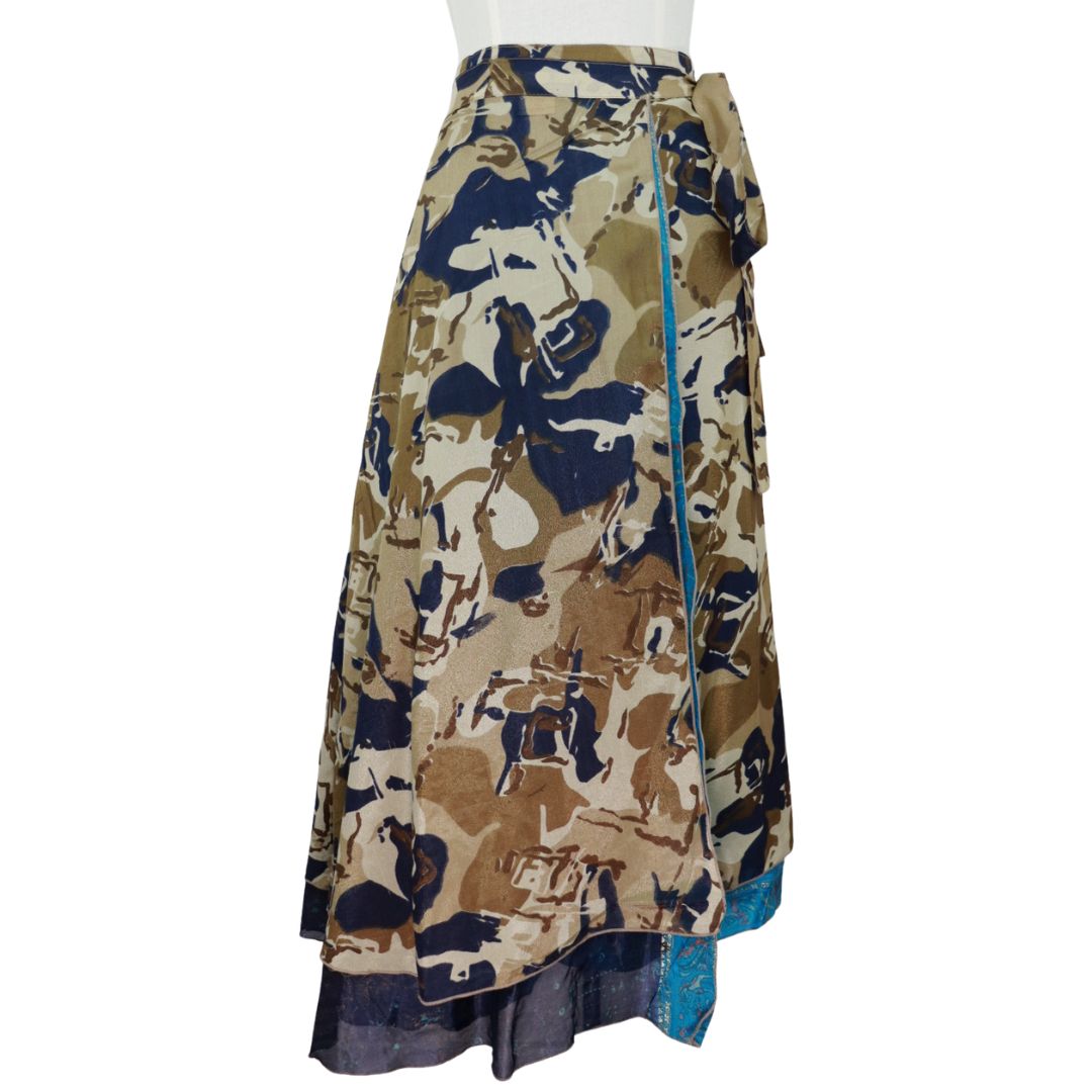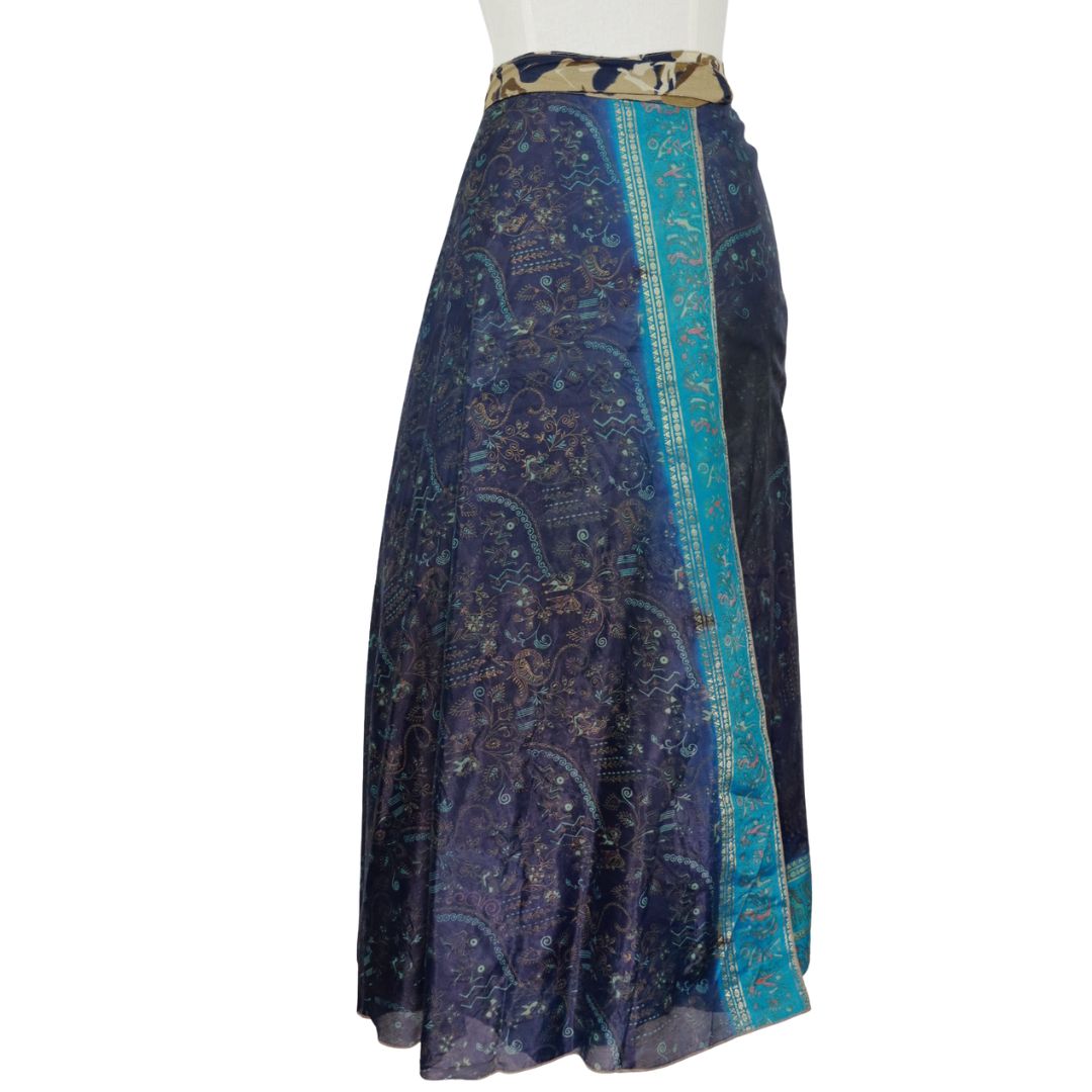 Traditionally Saris are often flamboyant and brightly coloured, frequently embroidered, and made from silk, cotton, or, in recent years, synthetic cloth such as viscose and polyester. We use retro Sari cloth in the majority of our garments so silk is a high component. It is not uncommon to find chiffon or georgette added into the mix which is why we refer to the skirts as a silk blend. We also use 'end of roll' sari fabrics.