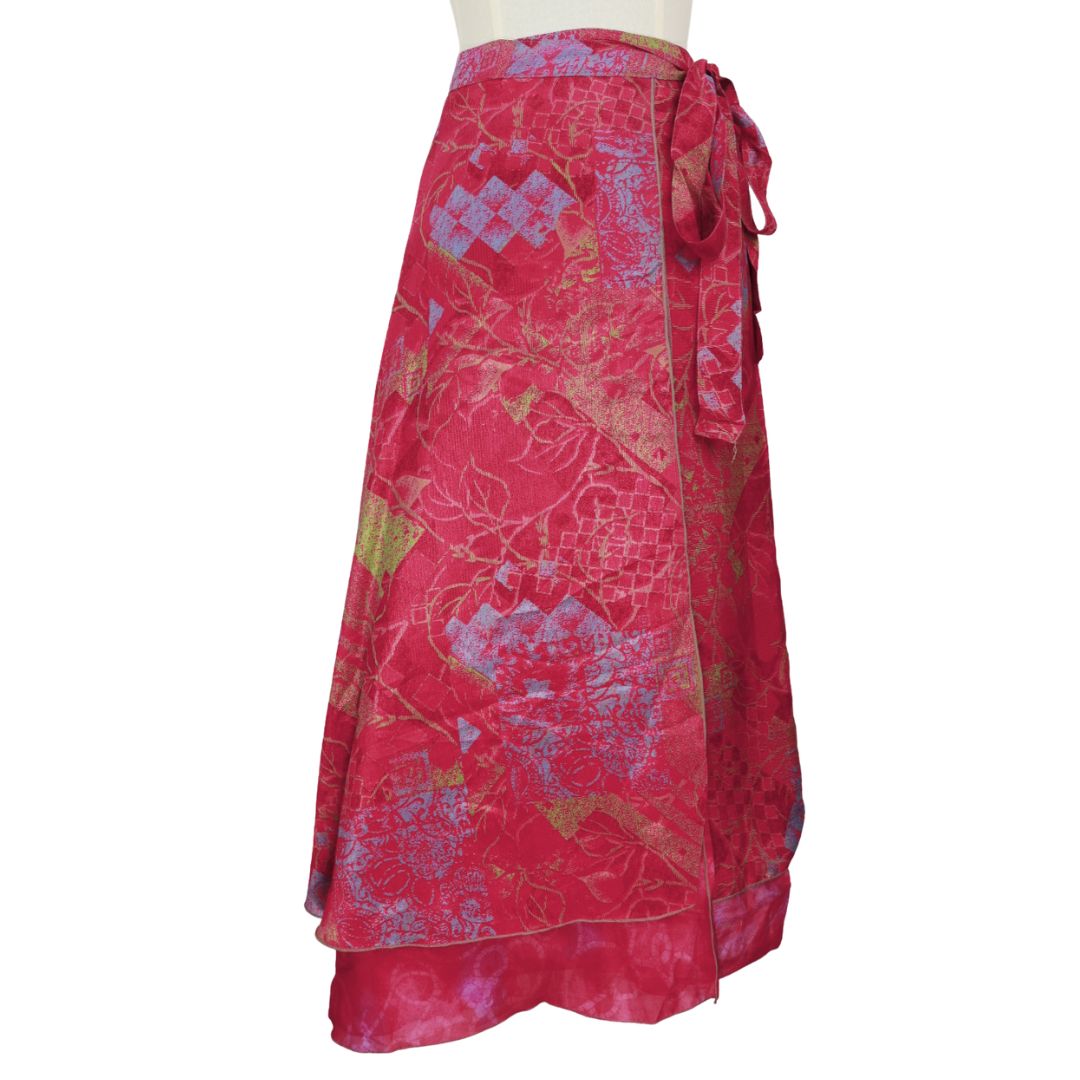 Traditionally Saris are often flamboyant and brightly coloured, frequently embroidered, and made from silk, cotton, or, in recent years, synthetic cloth such as viscose and polyester. We use retro Sari cloth in the majority of our garments so silk is a high component. It is not uncommon to find chiffon or georgette added into the mix which is why we refer to the skirts as a silk blend. We also use 'end of roll' sari fabrics.