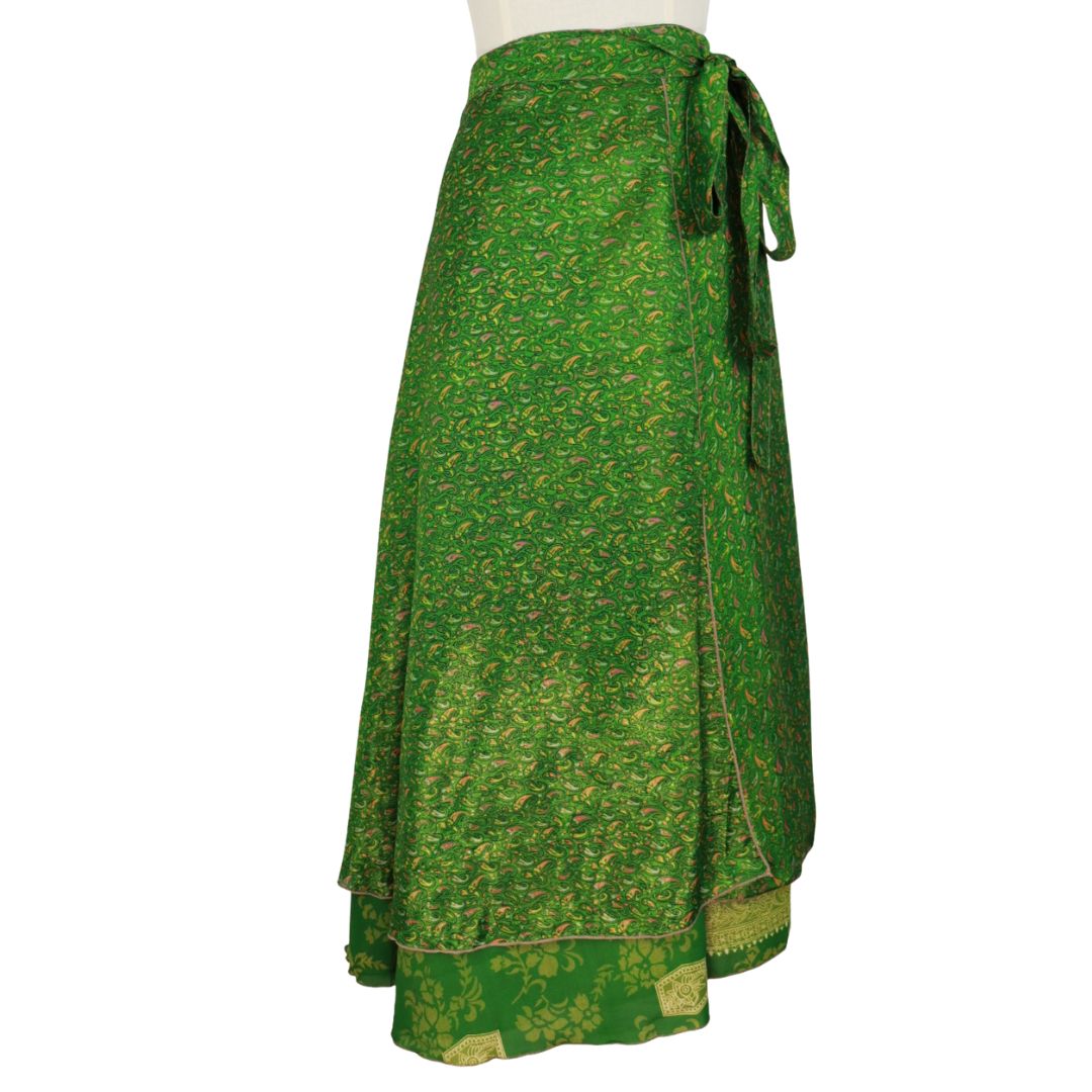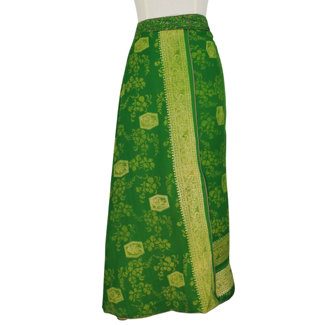Traditionally Saris are often flamboyant and brightly coloured, frequently embroidered, and made from silk, cotton, or, in recent years, synthetic cloth such as viscose and polyester. We use retro Sari cloth in the majority of our garments so silk is a high component. It is not uncommon to find chiffon or georgette added into the mix which is why we refer to the skirts as a silk blend. We also use 'end of roll' sari fabrics.