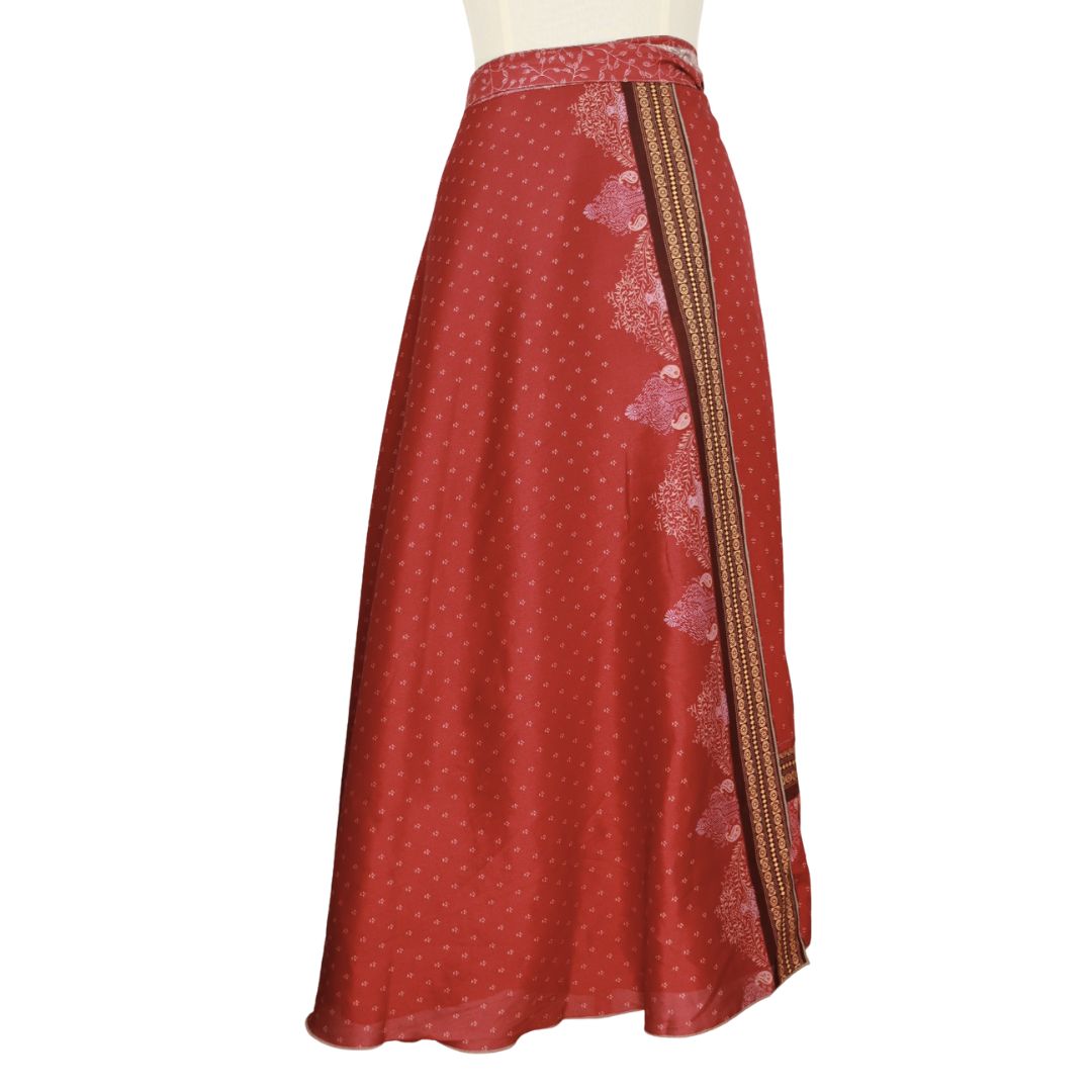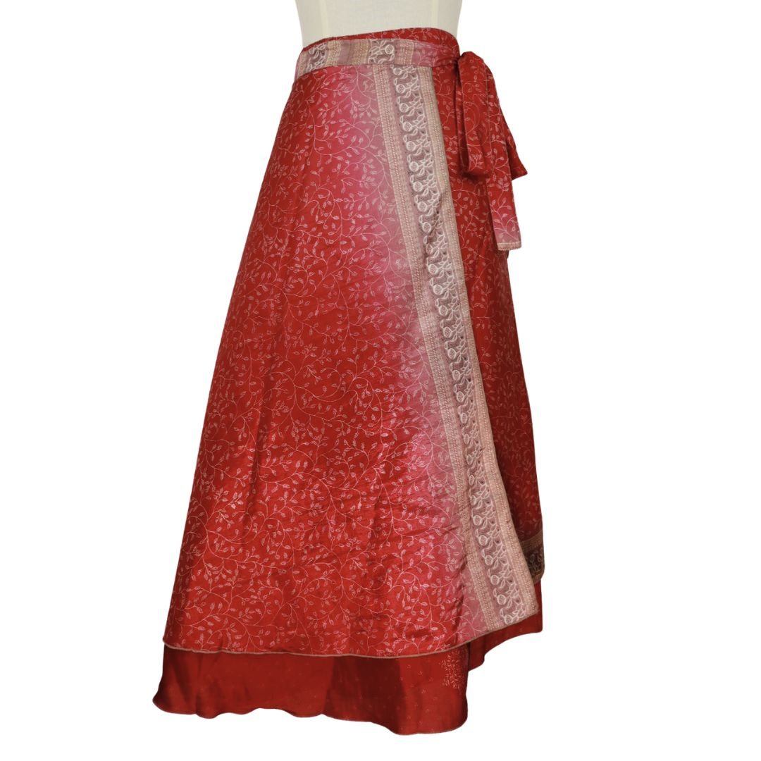 Traditionally Saris are often flamboyant and brightly coloured, frequently embroidered, and made from silk, cotton, or, in recent years, synthetic cloth such as viscose and polyester. We use retro Sari cloth in the majority of our garments so silk is a high component. It is not uncommon to find chiffon or georgette added into the mix which is why we refer to the skirts as a silk blend. We also use 'end of roll' sari fabrics.