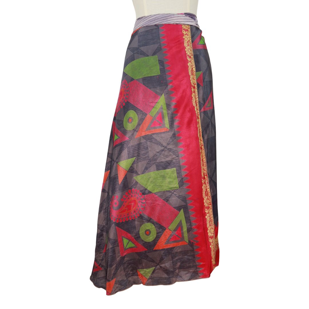 Traditionally Saris are often flamboyant and brightly coloured, frequently embroidered, and made from silk, cotton, or, in recent years, synthetic cloth such as viscose and polyester. We use retro Sari cloth in the majority of our garments so silk is a high component. It is not uncommon to find chiffon or georgette added into the mix which is why we refer to the skirts as a silk blend. We also use 'end of roll' sari fabrics.