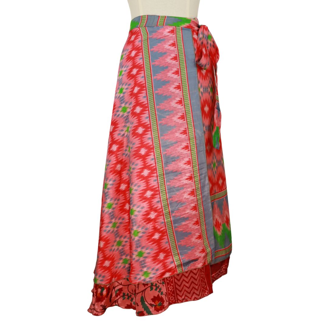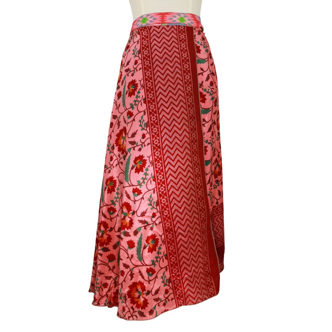 Traditionally Saris are often flamboyant and brightly coloured, frequently embroidered, and made from silk, cotton, or, in recent years, synthetic cloth such as viscose and polyester. We use retro Sari cloth in the majority of our garments so silk is a high component. It is not uncommon to find chiffon or georgette added into the mix which is why we refer to the skirts as a silk blend. We also use 'end of roll' sari fabrics.