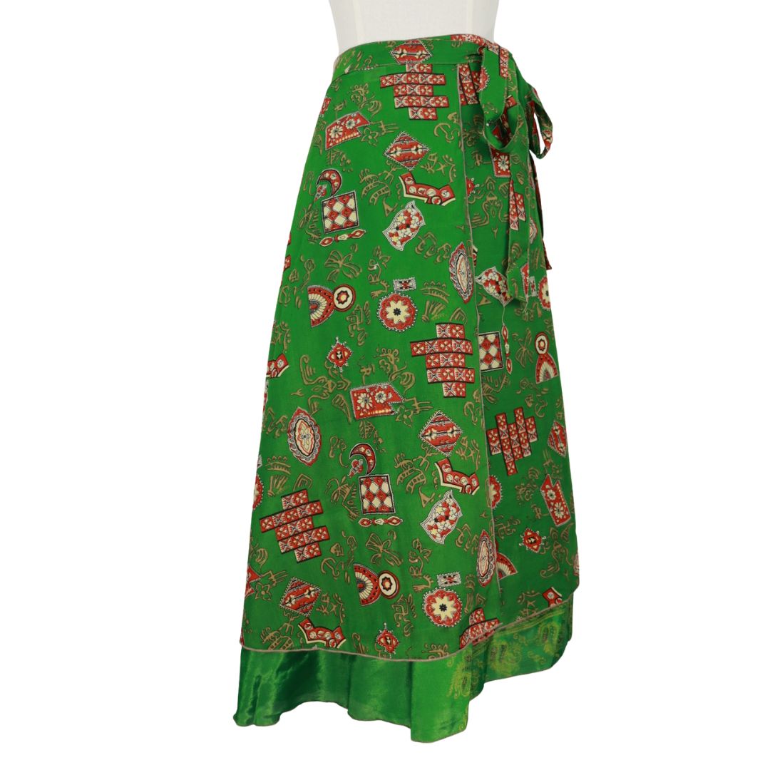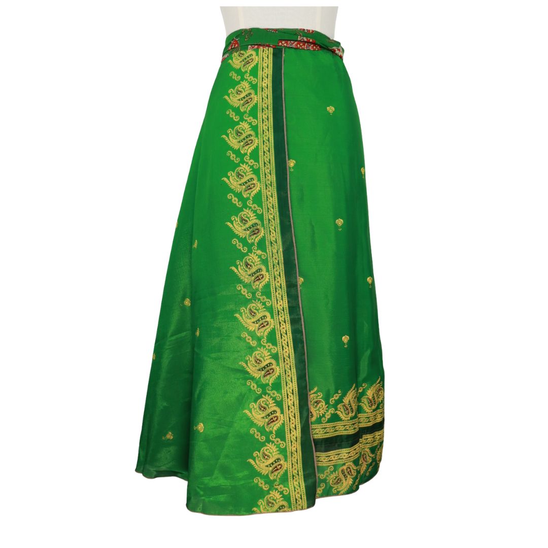 Traditionally Saris are often flamboyant and brightly coloured, frequently embroidered, and made from silk, cotton, or, in recent years, synthetic cloth such as viscose and polyester. We use retro Sari cloth in the majority of our garments so silk is a high component. It is not uncommon to find chiffon or georgette added into the mix which is why we refer to the skirts as a silk blend. We also use 'end of roll' sari fabrics.