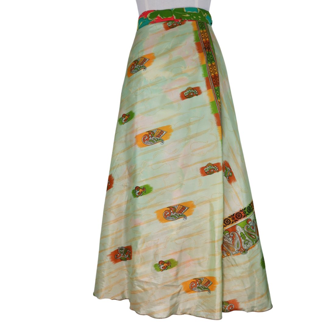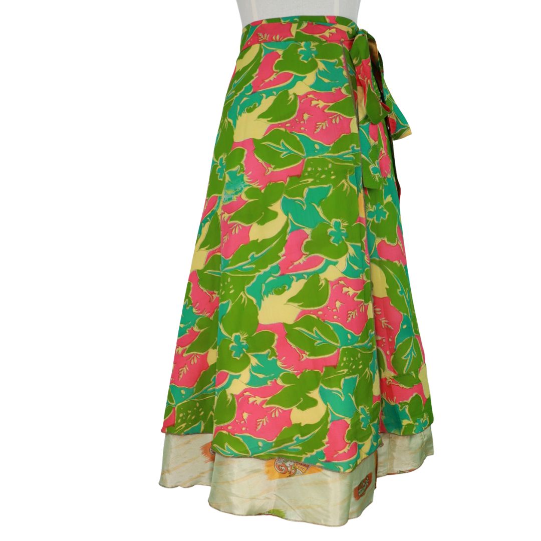 Traditionally Saris are often flamboyant and brightly coloured, frequently embroidered, and made from silk, cotton, or, in recent years, synthetic cloth such as viscose and polyester. We use retro Sari cloth in the majority of our garments so silk is a high component. It is not uncommon to find chiffon or georgette added into the mix which is why we refer to the skirts as a silk blend. We also use 'end of roll' sari fabrics.