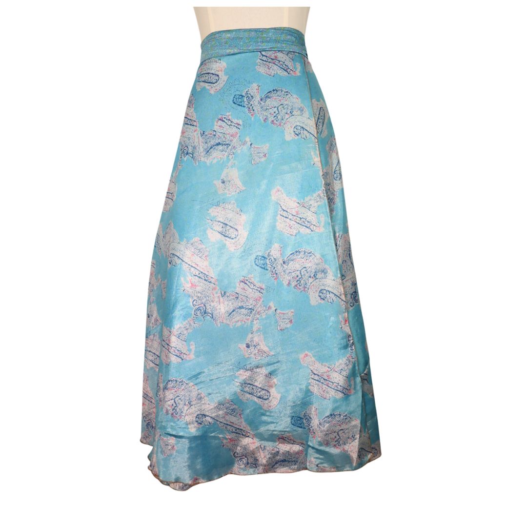 Traditionally Saris are often flamboyant and brightly coloured, frequently embroidered, and made from silk, cotton, or, in recent years, synthetic cloth such as viscose and polyester. We use retro Sari cloth in the majority of our garments so silk is a high component. It is not uncommon to find chiffon or georgette added into the mix which is why we refer to the skirts as a silk blend. We also use 'end of roll' sari fabrics.