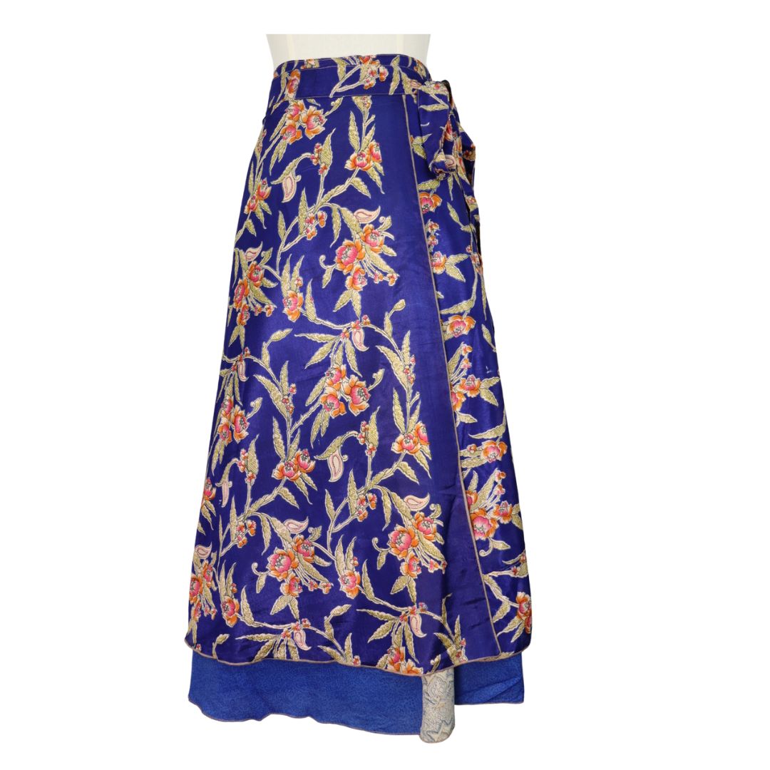 Traditionally Saris are often flamboyant and brightly coloured, frequently embroidered, and made from silk, cotton, or, in recent years, synthetic cloth such as viscose and polyester. We use retro Sari cloth in the majority of our garments so silk is a high component. It is not uncommon to find chiffon or georgette added into the mix which is why we refer to the skirts as a silk blend. We also use 'end of roll' sari fabrics.