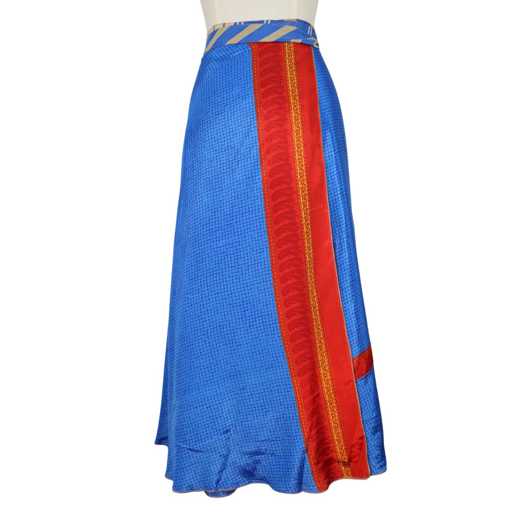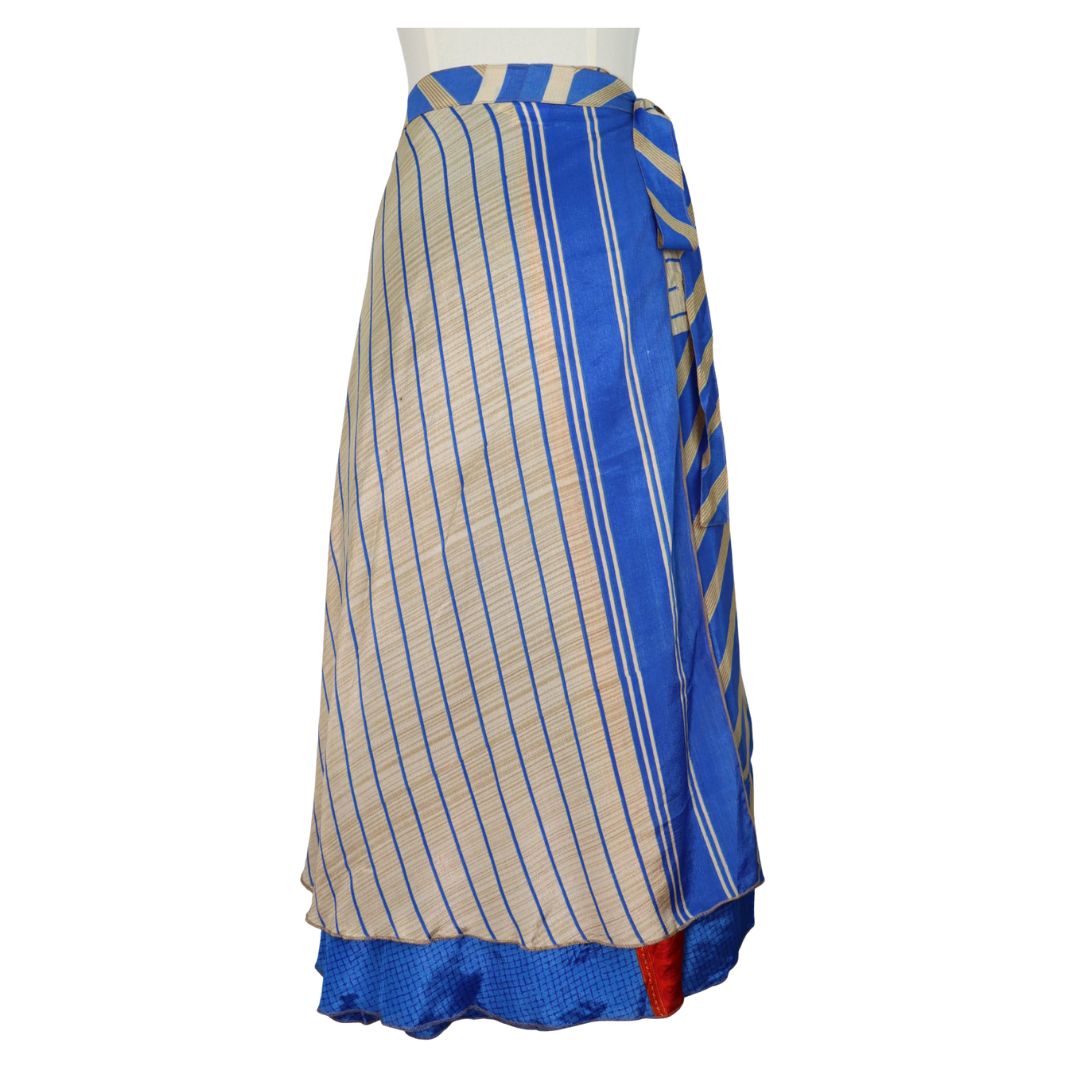 Traditionally Saris are often flamboyant and brightly coloured, frequently embroidered, and made from silk, cotton, or, in recent years, synthetic cloth such as viscose and polyester. We use retro Sari cloth in the majority of our garments so silk is a high component. It is not uncommon to find chiffon or georgette added into the mix which is why we refer to the skirts as a silk blend. We also use 'end of roll' sari fabrics.