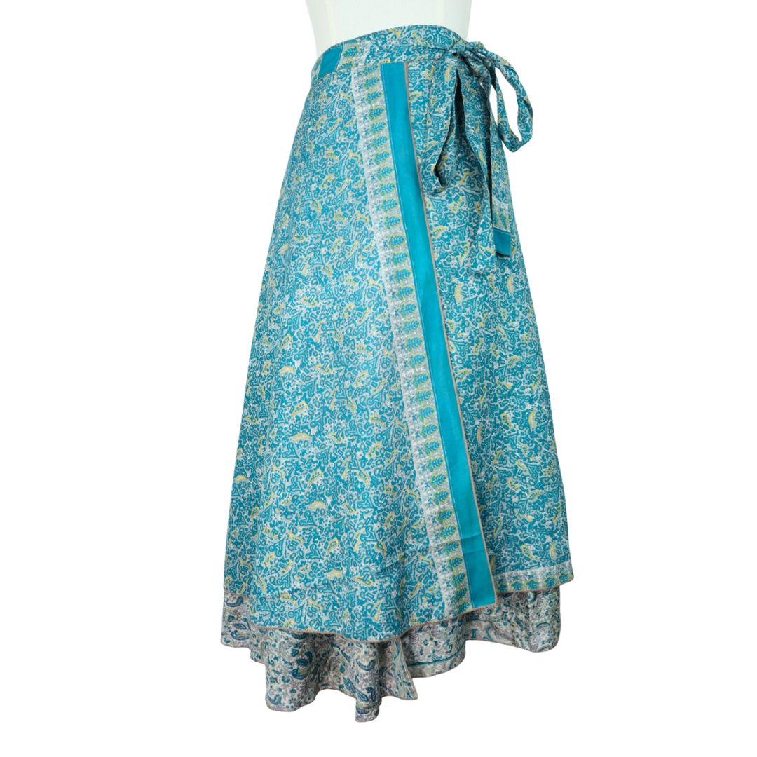 Traditionally Saris are often flamboyant and brightly coloured, frequently embroidered, and made from silk, cotton, or, in recent years, synthetic cloth such as viscose and polyester. We use retro Sari cloth in the majority of our garments so silk is a high component. It is not uncommon to find chiffon or georgette added into the mix which is why we refer to the skirts as a silk blend. We also use 'end of roll' sari fabrics.