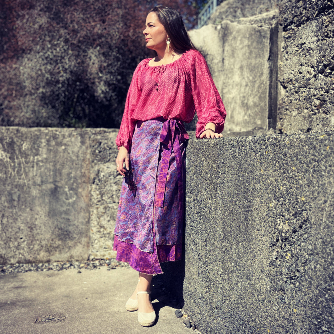 Traditionally Saris are often flamboyant and brightly coloured, frequently embroidered, and made from silk, cotton, or, in recent years, synthetic cloth such as viscose and polyester. We use retro Sari cloth in the majority of our garments so silk is a high component. It is not uncommon to find chiffon or georgette added into the mix which is why we refer to the skirts as a silk blend. We also use 'end of roll' sari fabrics.