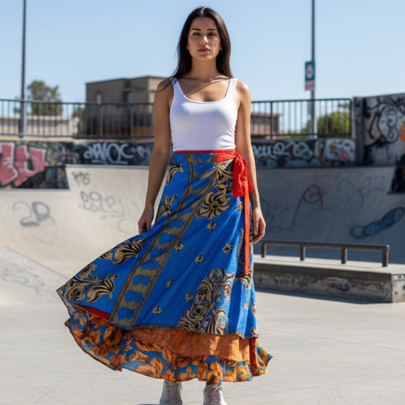 Traditionally Saris are often flamboyant and brightly coloured, frequently embroidered, and made from silk, cotton, or, in recent years, synthetic cloth such as viscose and polyester. We use retro Sari cloth in the majority of our garments so silk is a high component. It is not uncommon to find chiffon or georgette added into the mix which is why we refer to the skirts as a silk blend. We also use 'end of roll' sari fabrics.