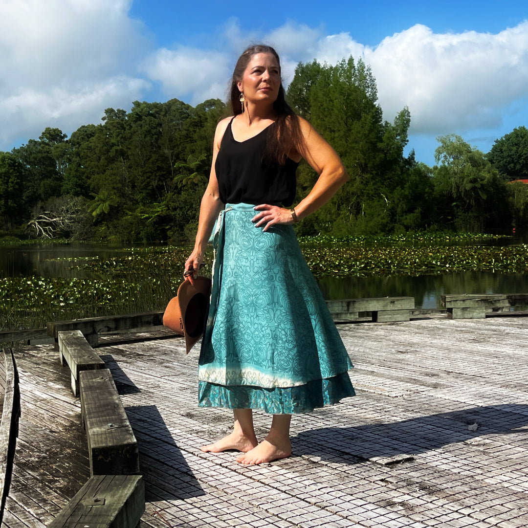 Traditionally Saris are often flamboyant and brightly coloured, frequently embroidered, and made from silk, cotton, or, in recent years, synthetic cloth such as viscose and polyester. We use retro Sari cloth in the majority of our garments so silk is a high component. It is not uncommon to find chiffon or georgette added into the mix which is why we refer to the skirts as a silk blend. We also use 'end of roll' sari fabrics.