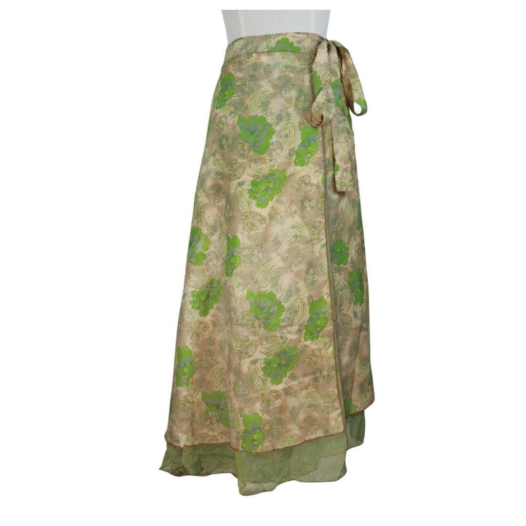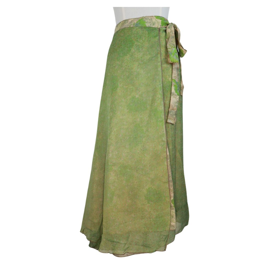 Traditionally Saris are often flamboyant and brightly coloured, frequently embroidered, and made from silk, cotton, or, in recent years, synthetic cloth such as viscose and polyester. We use retro Sari cloth in the majority of our garments so silk is a high component. It is not uncommon to find chiffon or georgette added into the mix which is why we refer to the skirts as a silk blend. We also use 'end of roll' sari fabrics.