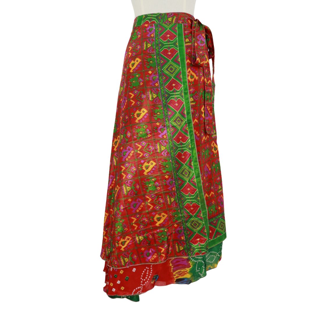 Traditionally Saris are often flamboyant and brightly coloured, frequently embroidered, and made from silk, cotton, or, in recent years, synthetic cloth such as viscose and polyester. We use retro Sari cloth in the majority of our garments so silk is a high component. It is not uncommon to find chiffon or georgette added into the mix which is why we refer to the skirts as a silk blend. We also use 'end of roll' sari fabrics.