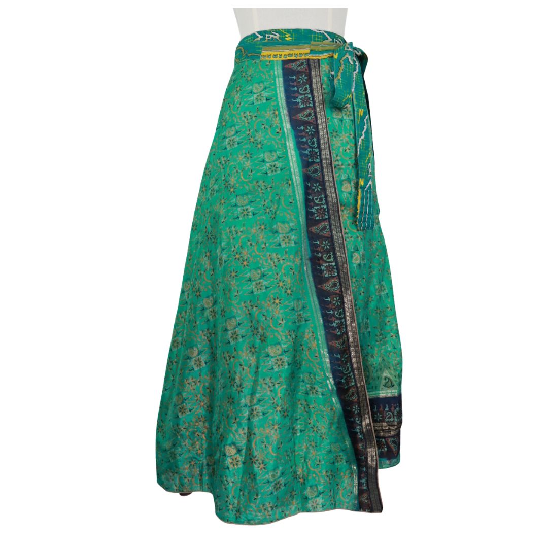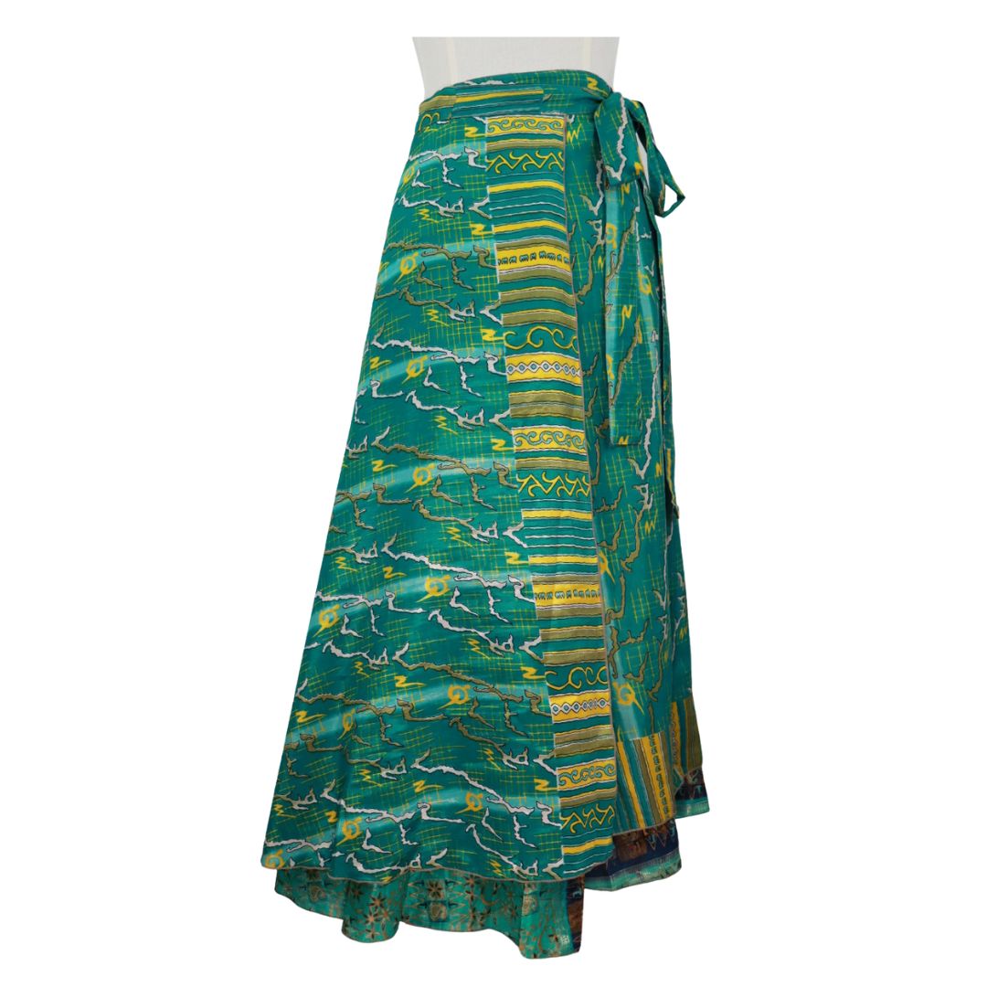 Traditionally Saris are often flamboyant and brightly coloured, frequently embroidered, and made from silk, cotton, or, in recent years, synthetic cloth such as viscose and polyester. We use retro Sari cloth in the majority of our garments so silk is a high component. It is not uncommon to find chiffon or georgette added into the mix which is why we refer to the skirts as a silk blend. We also use 'end of roll' sari fabrics.