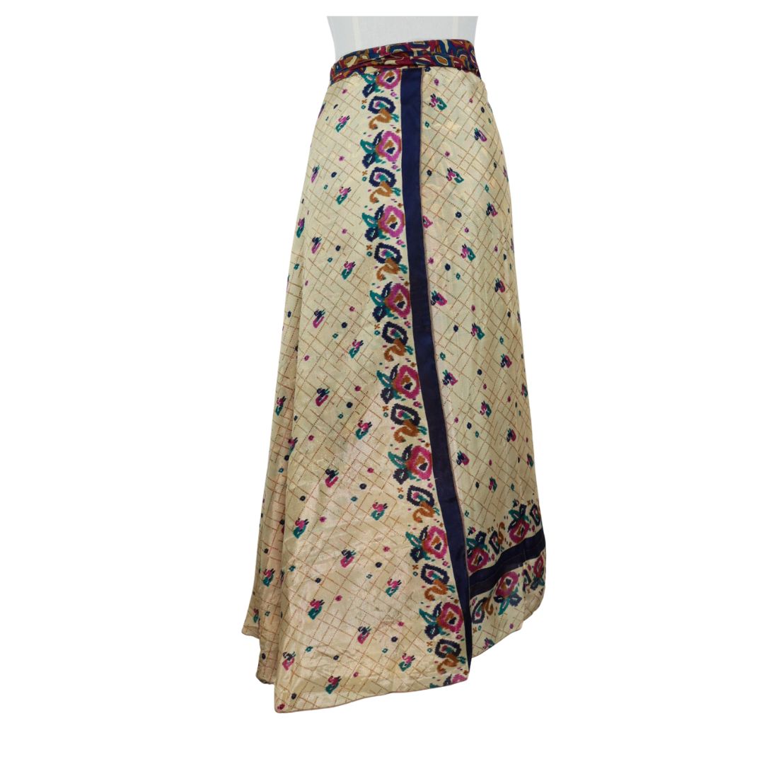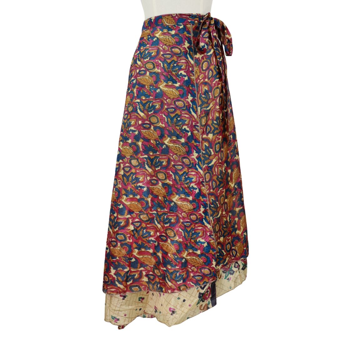 Traditionally Saris are often flamboyant and brightly coloured, frequently embroidered, and made from silk, cotton, or, in recent years, synthetic cloth such as viscose and polyester. We use retro Sari cloth in the majority of our garments so silk is a high component. It is not uncommon to find chiffon or georgette added into the mix which is why we refer to the skirts as a silk blend. We also use 'end of roll' sari fabrics.