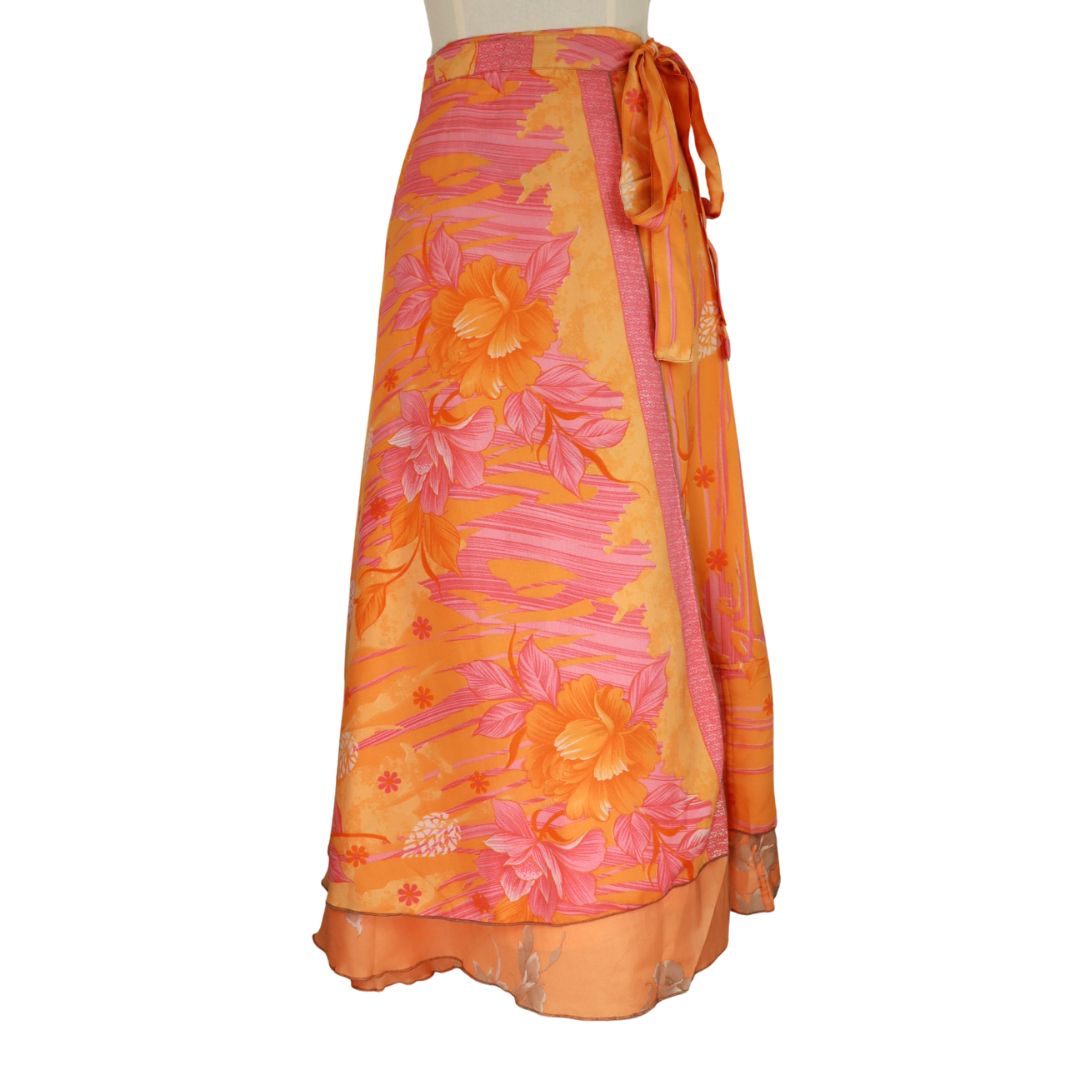 Traditionally Saris are often flamboyant and brightly coloured, frequently embroidered, and made from silk, cotton, or, in recent years, synthetic cloth such as viscose and polyester. We use retro Sari cloth in the majority of our garments so silk is a high component. It is not uncommon to find chiffon or georgette added into the mix which is why we refer to the skirts as a silk blend. We also use 'end of roll' sari fabrics.