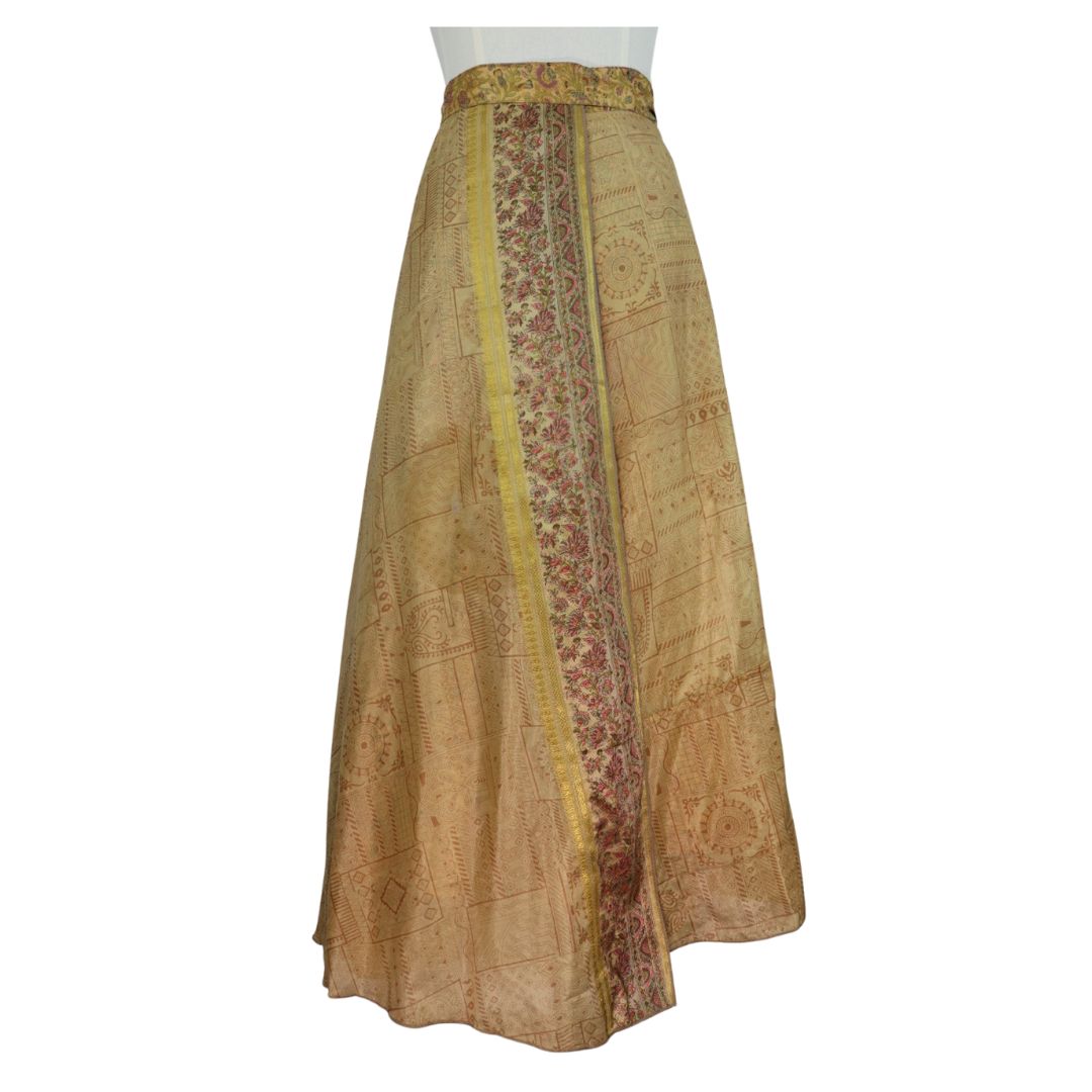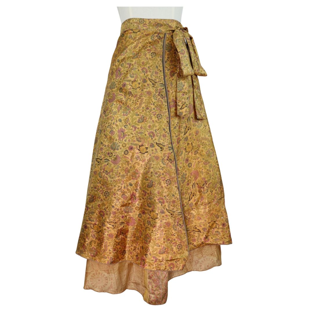 Traditionally Saris are often flamboyant and brightly coloured, frequently embroidered, and made from silk, cotton, or, in recent years, synthetic cloth such as viscose and polyester. We use retro Sari cloth in the majority of our garments so silk is a high component. It is not uncommon to find chiffon or georgette added into the mix which is why we refer to the skirts as a silk blend. We also use 'end of roll' sari fabrics.