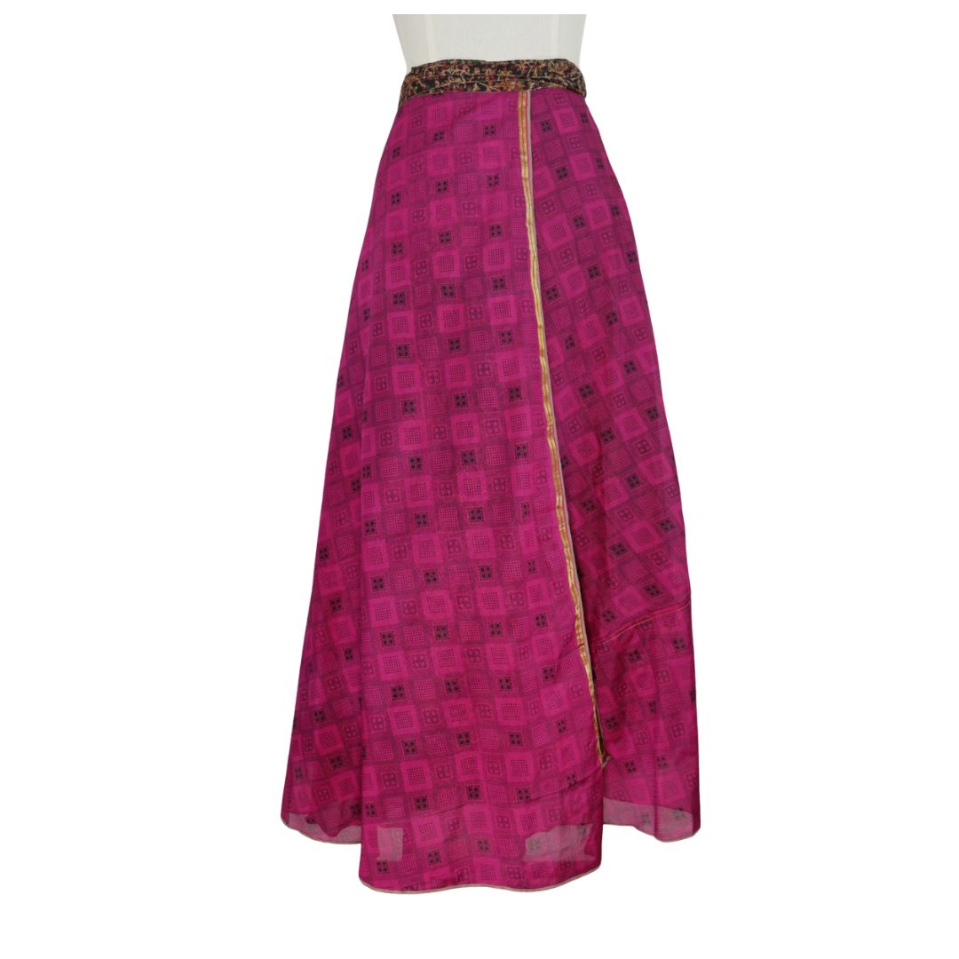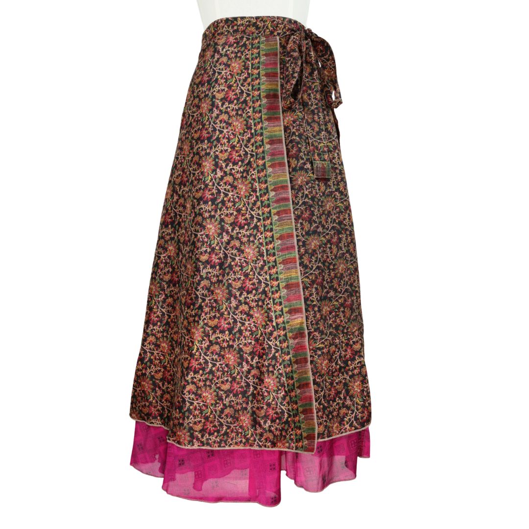 Traditionally Saris are often flamboyant and brightly coloured, frequently embroidered, and made from silk, cotton, or, in recent years, synthetic cloth such as viscose and polyester. We use retro Sari cloth in the majority of our garments so silk is a high component. It is not uncommon to find chiffon or georgette added into the mix which is why we refer to the skirts as a silk blend. We also use 'end of roll' sari fabrics.