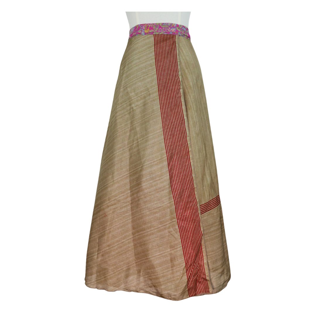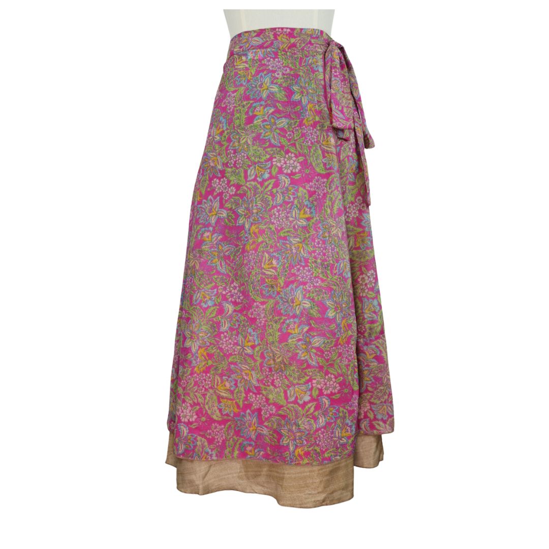 Traditionally Saris are often flamboyant and brightly coloured, frequently embroidered, and made from silk, cotton, or, in recent years, synthetic cloth such as viscose and polyester. We use retro Sari cloth in the majority of our garments so silk is a high component. It is not uncommon to find chiffon or georgette added into the mix which is why we refer to the skirts as a silk blend. We also use 'end of roll' sari fabrics.