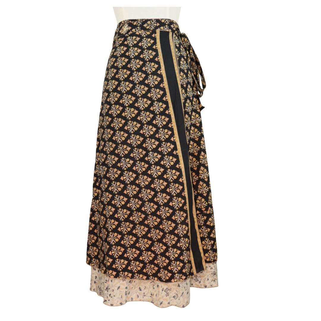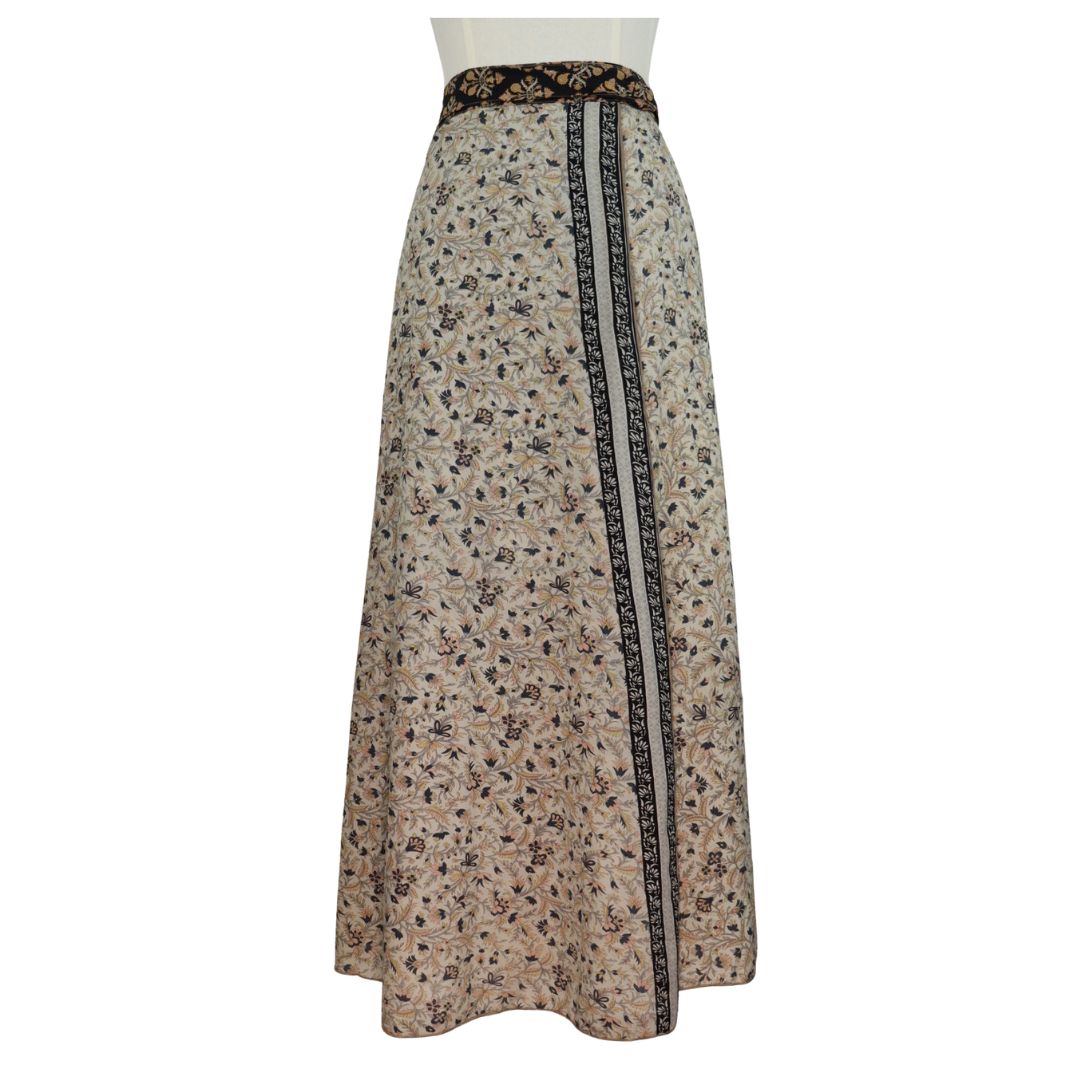 Traditionally Saris are often flamboyant and brightly coloured, frequently embroidered, and made from silk, cotton, or, in recent years, synthetic cloth such as viscose and polyester. We use retro Sari cloth in the majority of our garments so silk is a high component. It is not uncommon to find chiffon or georgette added into the mix which is why we refer to the skirts as a silk blend. We also use 'end of roll' sari fabrics.