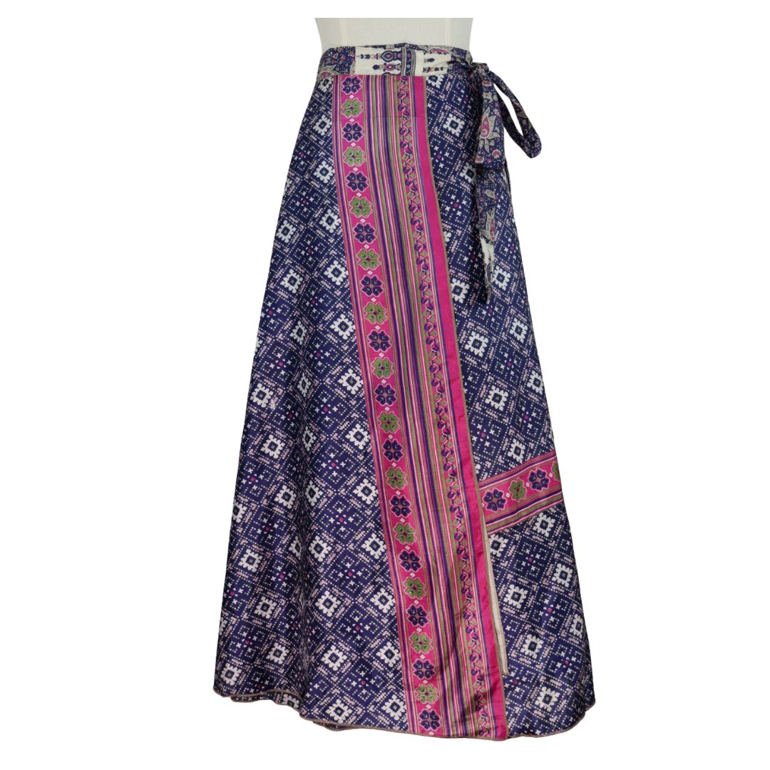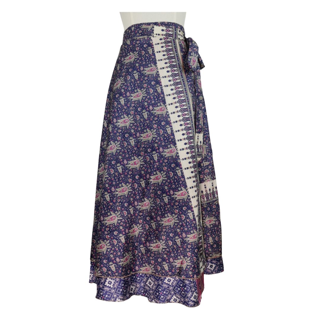 Traditionally Saris are often flamboyant and brightly coloured, frequently embroidered, and made from silk, cotton, or, in recent years, synthetic cloth such as viscose and polyester. We use retro Sari cloth in the majority of our garments so silk is a high component. It is not uncommon to find chiffon or georgette added into the mix which is why we refer to the skirts as a silk blend. We also use 'end of roll' sari fabrics.